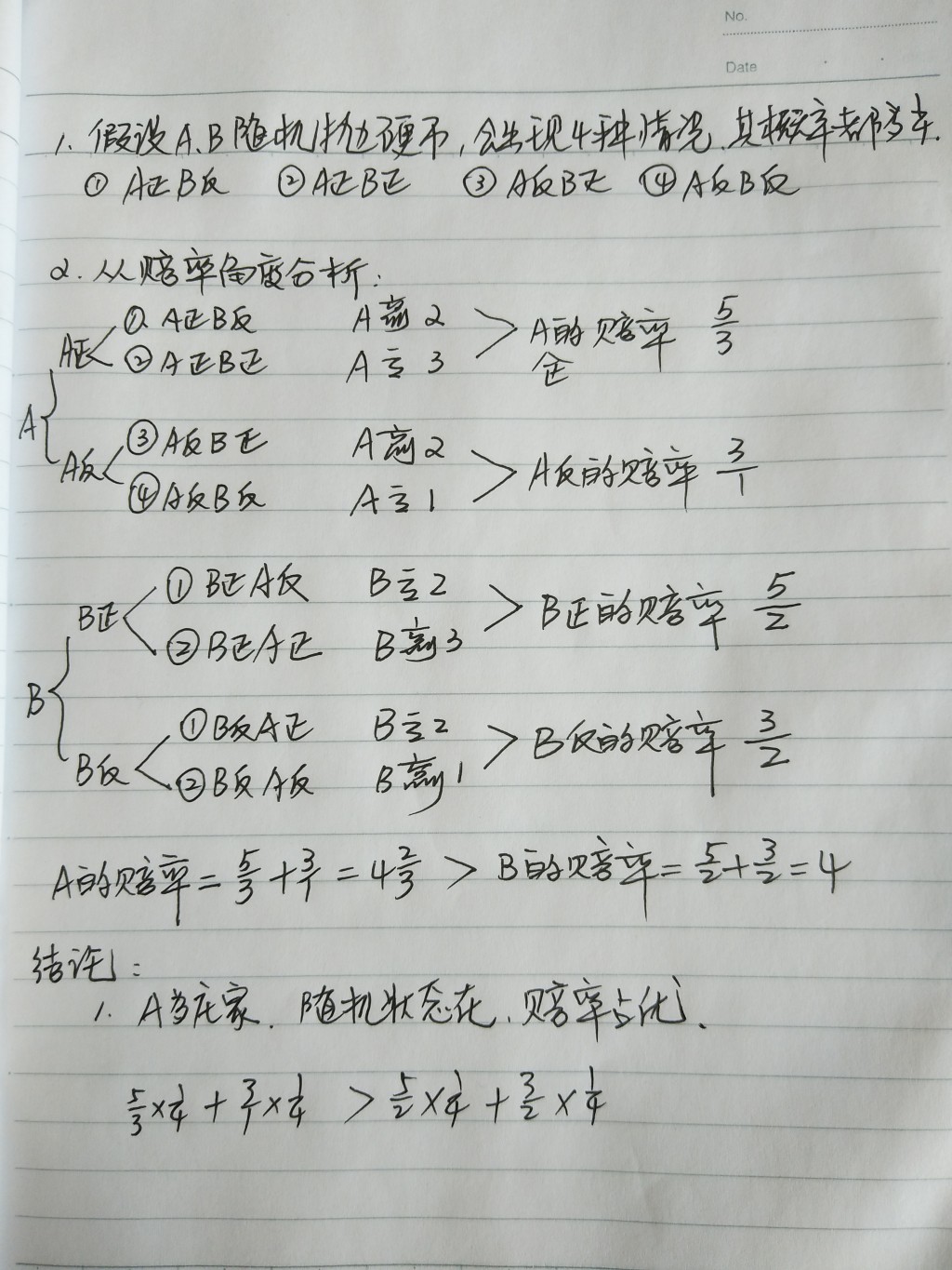 多年前听朋友说了关于game theory 里Nash均衡的这个小游戏。后来拿python写了个脚本验证了下,的确有效。甚至赔率还可以高一点,比如输了付3.3和1.3,赢了还是拿2。看上去整个局偏向于B,实际上只要玩的回合足够多,A仍然是稳定盈利的。