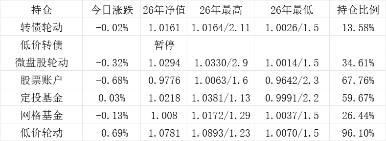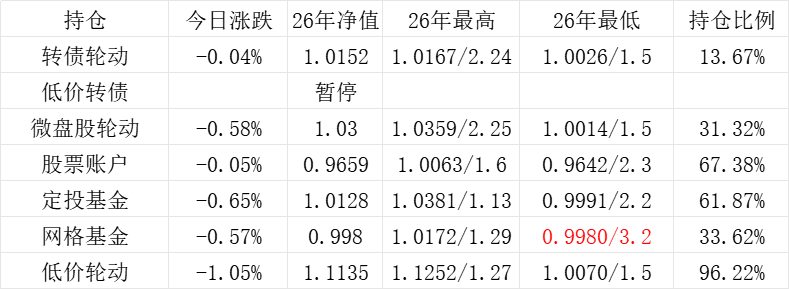 3、微盘股轮动年初净值为1.000,今日 -0.45%,净值为1.1534。本年最高净值1.1816(11.14),最低净值1.000(1.2),仓位58.72%