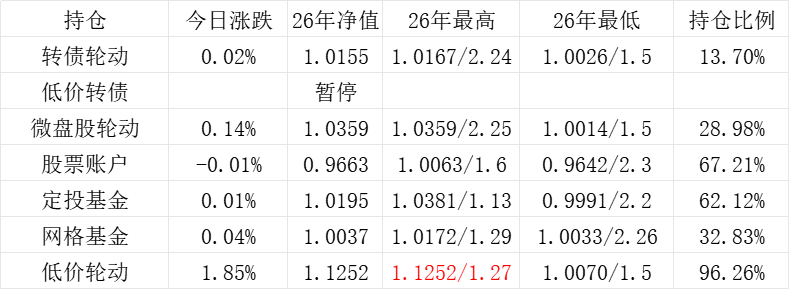 3、微盘股轮动年初净值为1.000,今日 +0.14%,净值为1.0014。本年最高净值1.0014(1.5),最低净值1.0014(1.5),仓位48.60%
