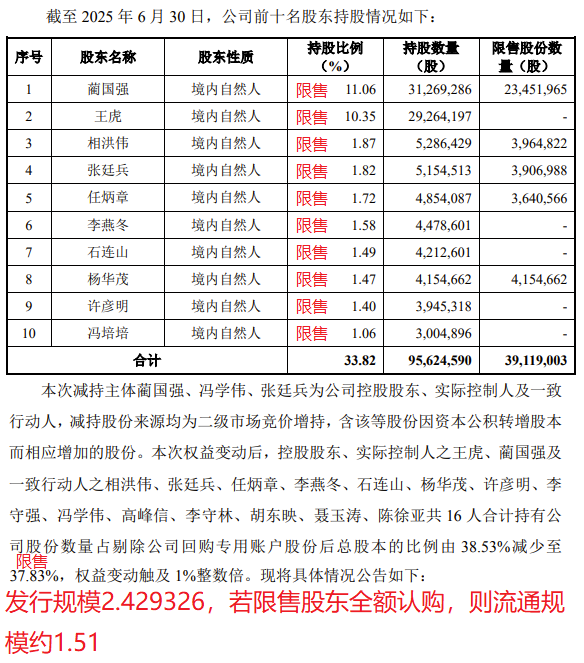 本次权益变动后,控股股东、实际控制人之王虎、蔺国强及一致行动人之相洪伟、张廷兵、任炳章、李燕冬、石连山、杨华茂、许彦明、李守强、冯学伟、高峰信、李守林、胡东映、聂玉涛、陈徐亚共16 人合计持有公司股份数量占剔除公司回购专用账户股份后总股本的比例由38.53%减少至37.83%