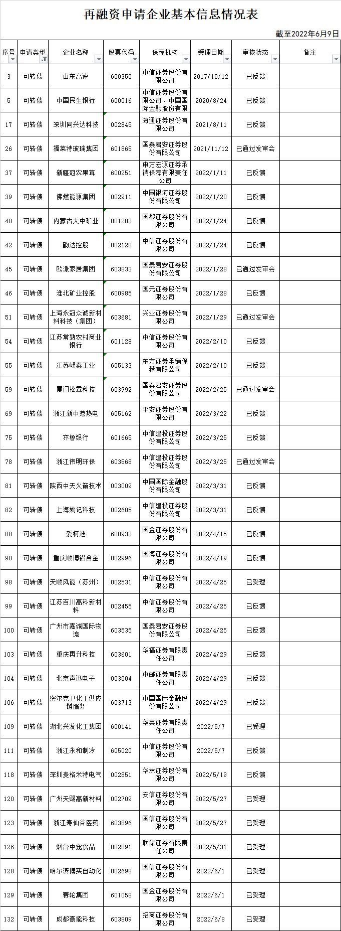 更新时间2022年8月12日。jsl待发数据页面对照zjh(每周更新)和沪深交易所(每日更新)的可转债申请进度,发现有几个漏掉的,就写在这里。发行规模可能也不对,有错就提交给jsl,但不能保证jsl都能修改。https://www.jisilu.cn/data/cbnew/#pre漏zjh受理:山东高速(基本弃疗)、民生银行漏上交所受理:无漏深交所受理:无zjh注册:创业板南大光电、泰福泵业、东...谢谢!