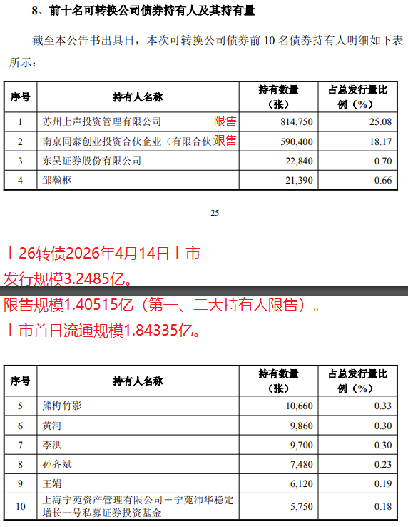 上声电子:苏州上声电子股份有限公司关于上声转债停止转股的提示性公告http://static.cninfo.com.cn/finalpage/2026-03-10/1225001088.PDF公司拟实施本期可转债发行工作,原股东优先配售认购日与网上申购日为 2026 年 3 月 18 日,股权登记日为2026 年3 月17 日,本期可转债募集说明书及发行公告将于 2026 年3 月16 日在上海...300股,9000元的成本,预计上市200-260,盈利1000-1600,这个安全垫还可以。