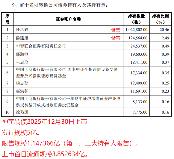 注 1:公司控股股东及实际控制人任凤娟获配数量为 1,022,802 张,实际控制人汤晓楠获配数量为 0 张,实际控制人汤建康获配数量为 124,564 张,实际控制人的一致行动人江阴市港汇科技信息有限公司获配数量为 0 张,实际控制人的一致行动人江阴市博宇投资有限公司获配数量为 0 张,合计数量为 1,147,366 张,约占本次发行总量的22.95%。