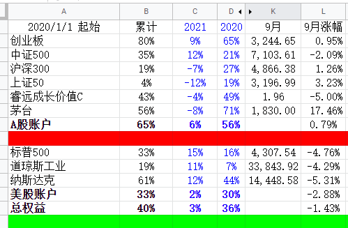 9月A股账户没亏,美股账户亏损较大(-2.88%),主要来自指数的回调和部分分红股的除权但是尚未派息