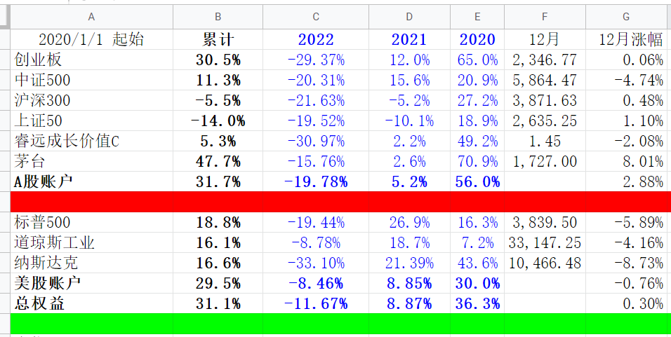 2021是滑铁卢的一年,年中一度收益20%左右,可惜不懂得见好就收。 不和jsl的各位比,因为投资能力非常有限,所以一直目标是希望能做到指数增强,可惜A股跑输了500和创业板,美股更是跑输三大指数,原因一部分是因为一直最大只上过80%仓位,另外就是能力不足,总觉得整个market太贵,想买的便宜,结果得不偿失。