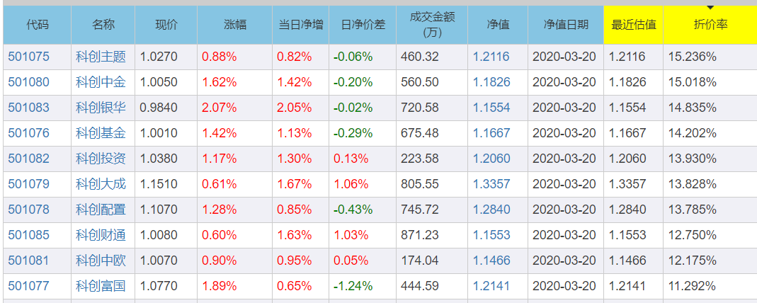 2019年6、7份,为了迎(支)接(持)科创板,各大基金公司,包括中金、富国、博时等等,纷纷成立了一批科技创新为主题的封闭基金,初心是布局科创板的基金,给投资人分享科创板的收益,特别是给没有达到开通科创板的投资人上车的机会。等建仓完成,才发现不少基金变了心,已经不是相亲初次见面的样子,大部分都是买入了主板、创业板的一些优质的科技股。目前,这部分基金的也成了目前市场上难得的一些折价较多的基金。