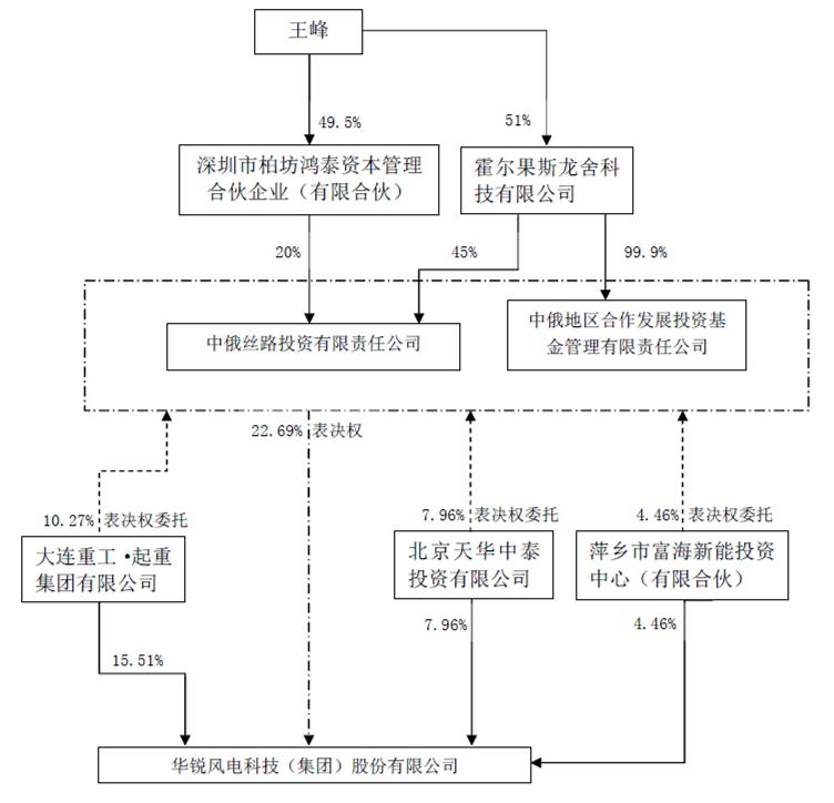本次表决权委托事项为公司股东大连重工.起重集团有限公司、北京天华中泰投资有限公司、萍乡市富海新能投资中心(有限合伙)将其所直接持有的公司股份共计 1,368,423,800 股表决权委托给中俄丝路投资有限责任公司(以下简称“中俄丝路”)和中俄地区合作发展投资基金管理有限责任公司(以下简称“中俄发展”),中俄丝路和中俄发展接受上述三家股东表决权委托后,可以实际支配的公司表决权股份合计 1,368,423,800 股,占公司总股本的 22.69%。●本次《表决权委托协议》签署并生效后,公司控制权将从无实际控制人、无控股股东变更为王峰为公司实际控制人、中俄丝路和中俄发展拥有公司最大表决权份额。●本次表决权委托事项所涉及的权益变动不涉及要约收购。●《表决权委托协议》已于 2020 年 3 月 30 日经大连重工•起重集团有限公司控股股东大连装备投资集团有限公司批准,此事项无需大连市国资委批准。●如公司未能成功保持在上海证券交易所的上市地位,则本协议自动解除。华锐风电科技(集团)股份有限公司(以下简称“公司”或“华锐风电”或“上市公司”)的三家股东大连重工.起重集团有限公司、北京天华中泰投资有限公司、萍乡市富海新能投资中心(有限合伙)与中俄丝路投资有限责任公司和中俄地区合作发展投资基金管理有限责任公司于 2020 年 3 月 30 日签署了《表决权委托协议》,将其所直接持有的公司股份共计 1,368,423,800 股表决权委托给中俄丝路和中俄发展,中俄丝路和中俄发展接受上述三家股东表决权委托后,可以实际支配的公司表决权股份合计 1,368,423,800 股,占公司总股本的 22.69%。自本协议签订生效后 18 个月内,除本协议各相关方之间转让股份外,各方不对外减持所持华锐风电股份。如上市公司未能成功保持其在上海证券交易所的上市地位,则本协议自动解除。《表决权委托协议》已于 2020 年 3 月 30 日经大连重工•起重集团有限公司控股股东大连装备投资集团有限公司批准,此事项无需大连市国资委批准。