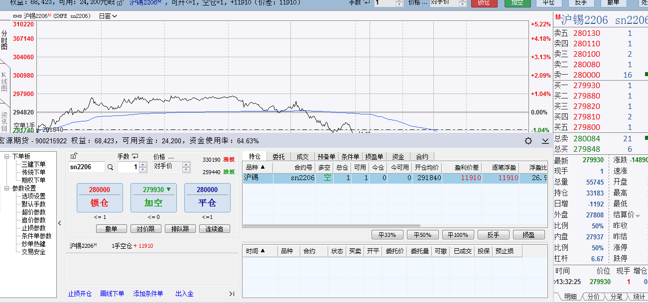 因工作原因好久没有操作了,这次空了锡,总体开空位置不是太好,已经4连阴开的,但周线和月线还可以,如果获利大就平了,不长线了