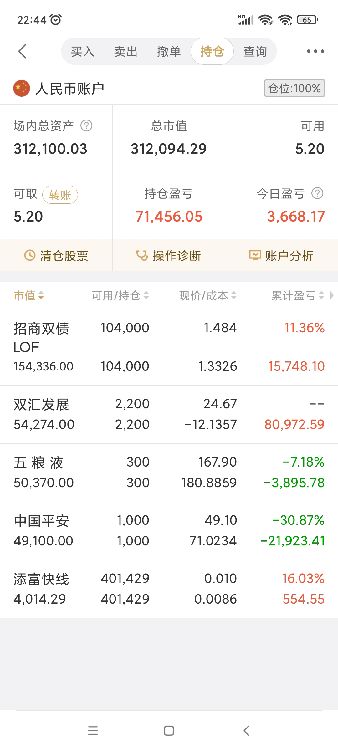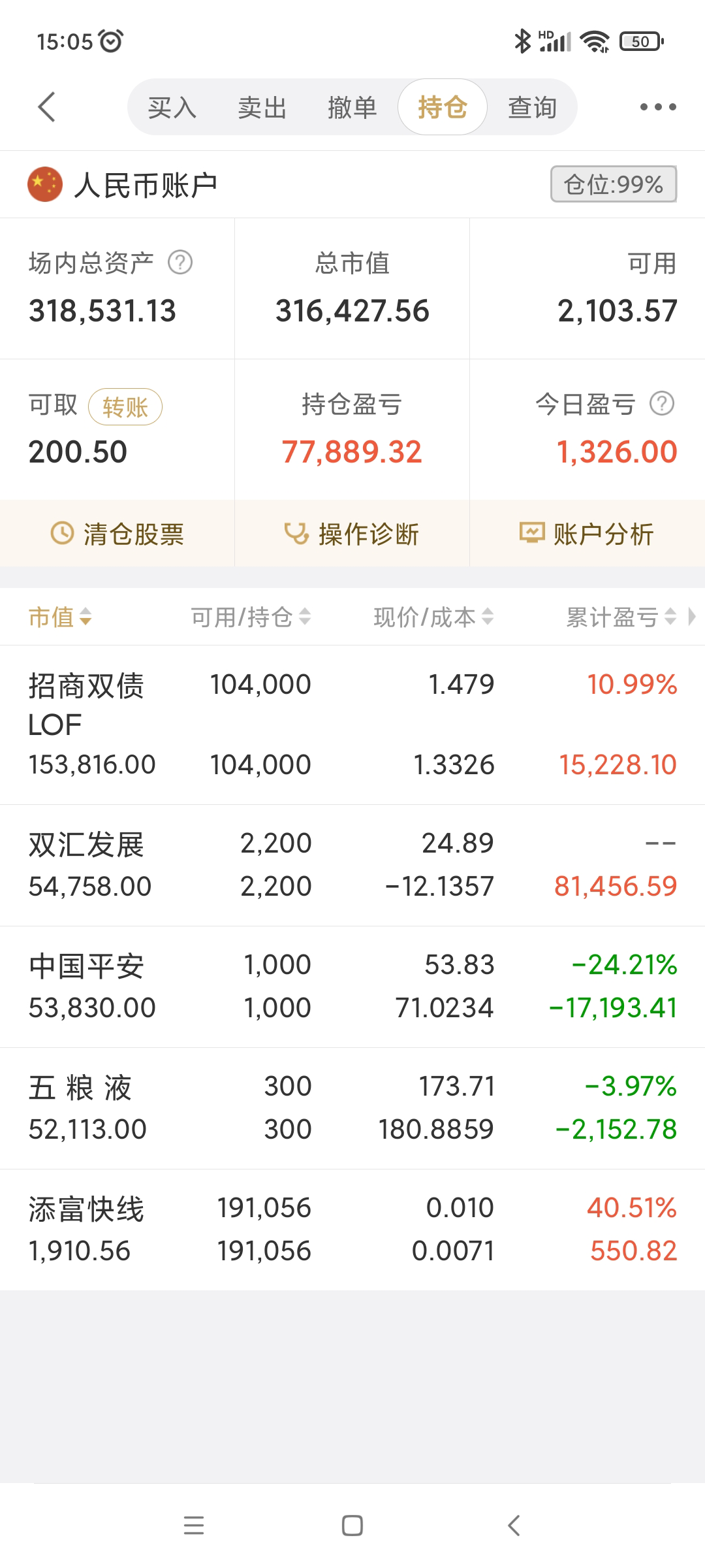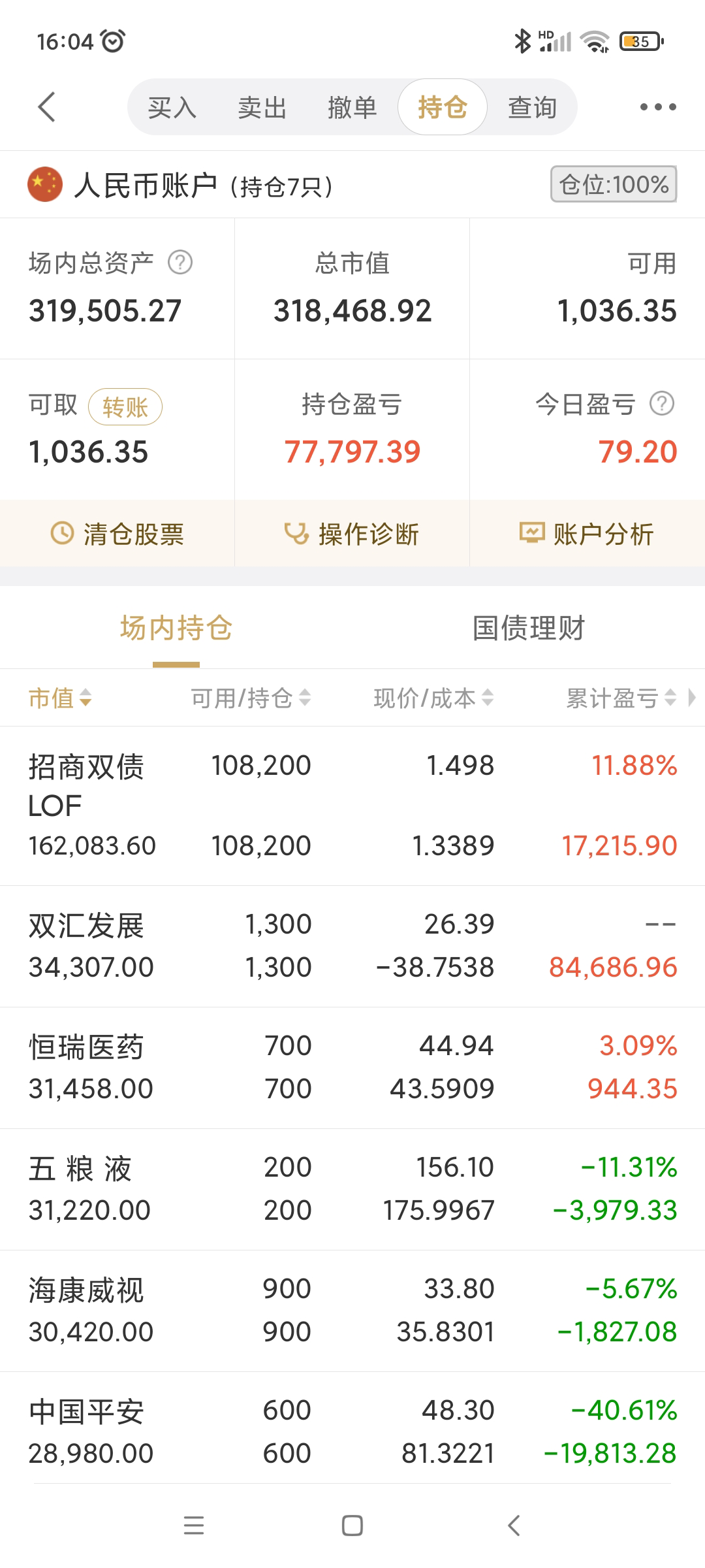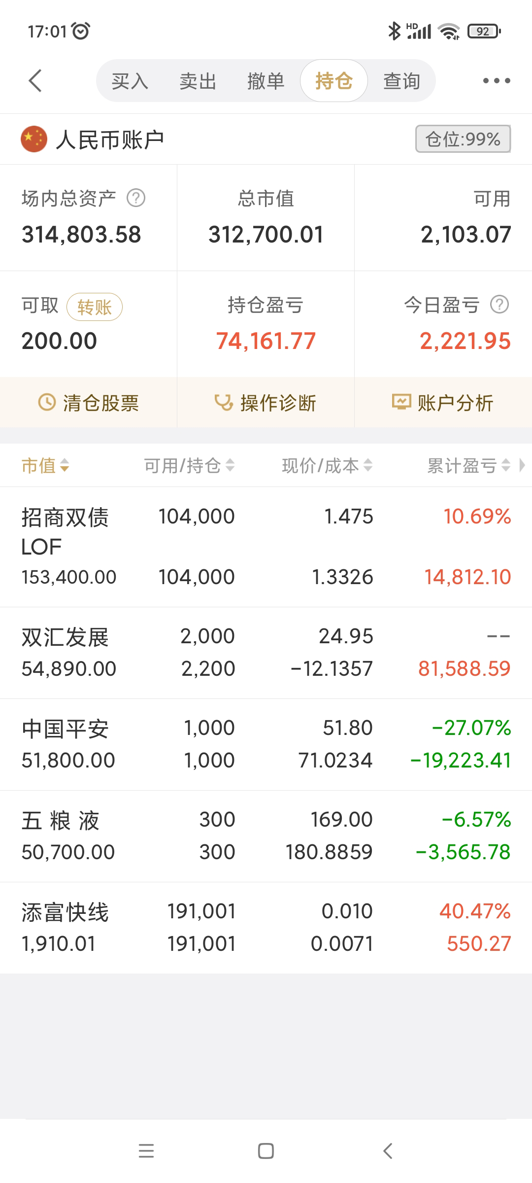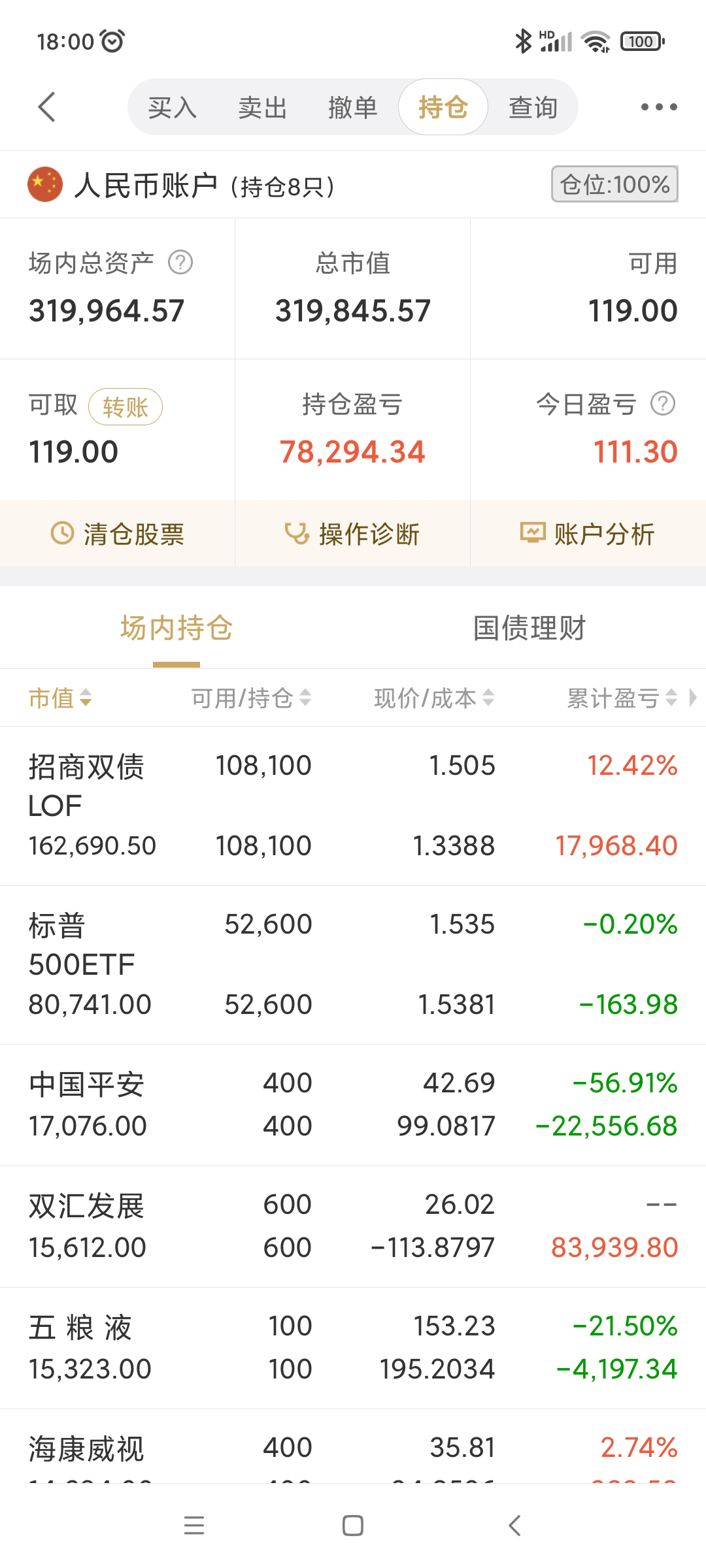 选股原因:选择中国平安是因为公司好,属于行业龙头,业绩长期向上,基本面无需置疑,被黑天鹅退市几率极小,股价具备长期向上趋势的确定性较强;选择双汇发展的原因与中国平安类似,不同之处是属于笔者的心水股,长期跟踪持有已经很多年,有感情舍不得换股。两只股票隶属上海交易所和深圳交易所各一只,配置后可以作为打新底仓。招商双债在同类基金里面属于排名前10,选它最重要的因素是场内交易量较大,流动性不存在问题;