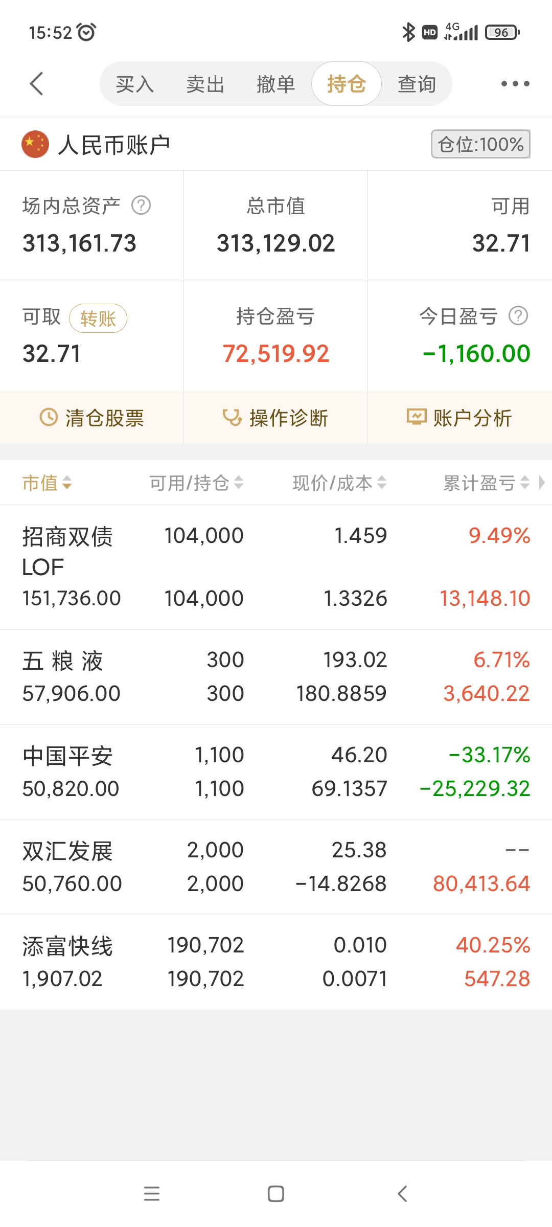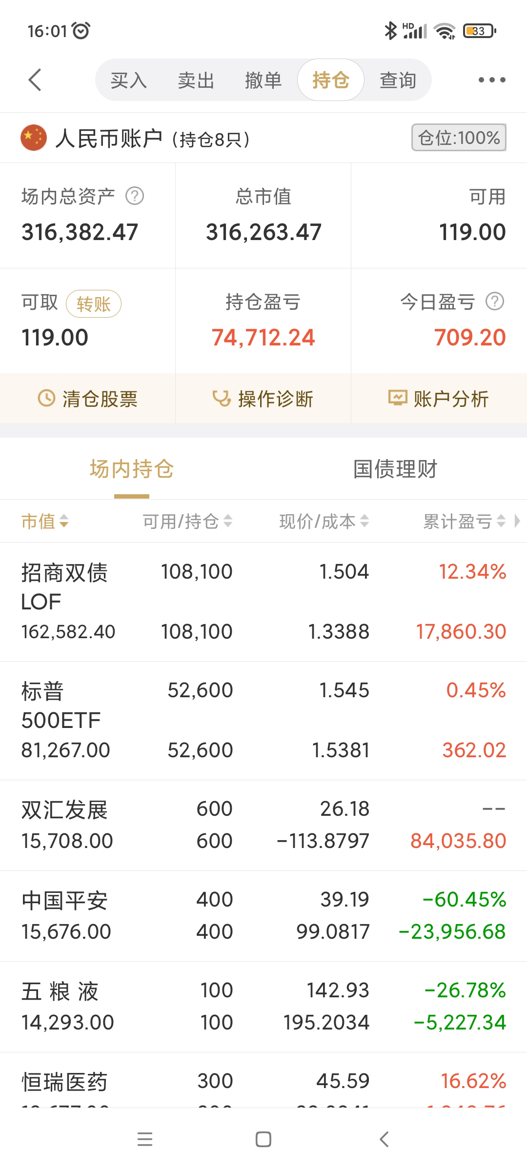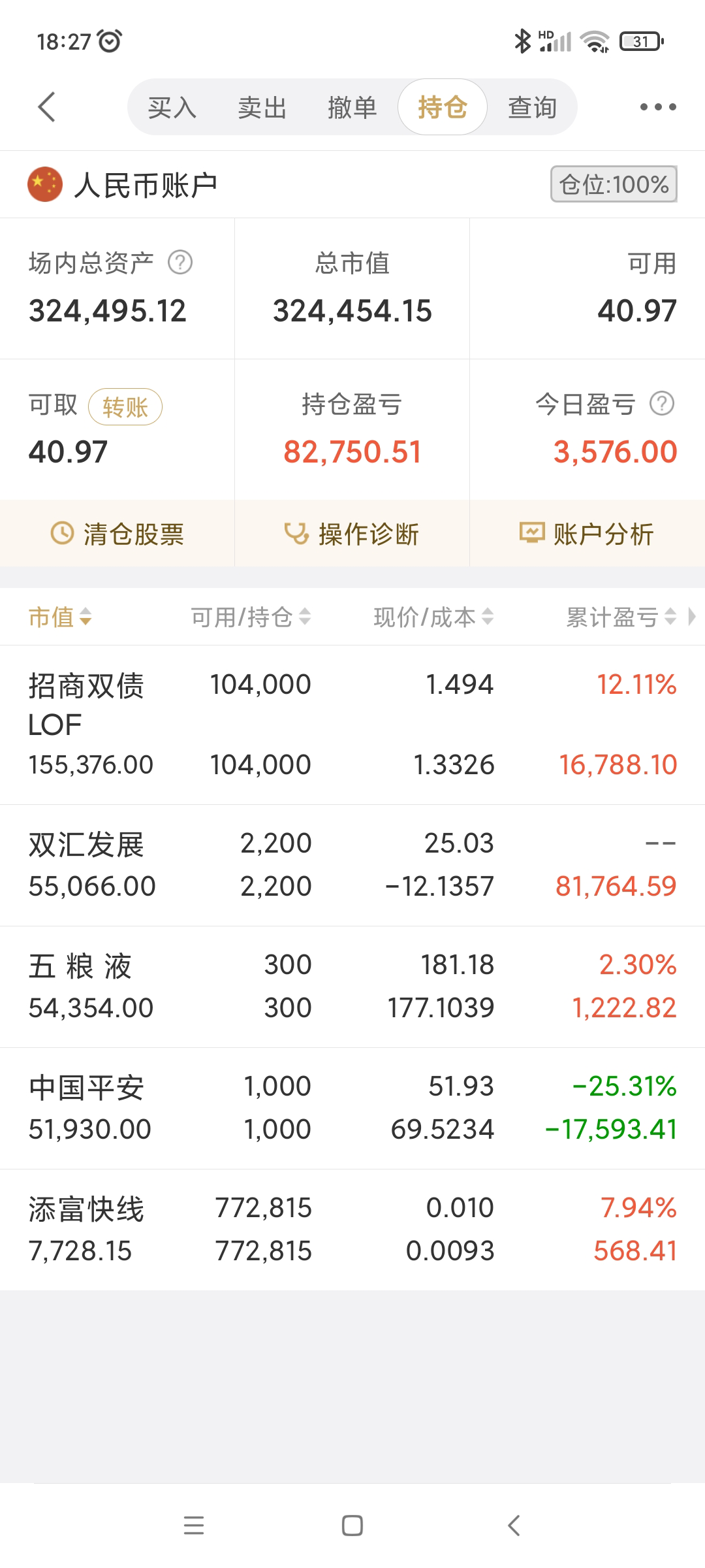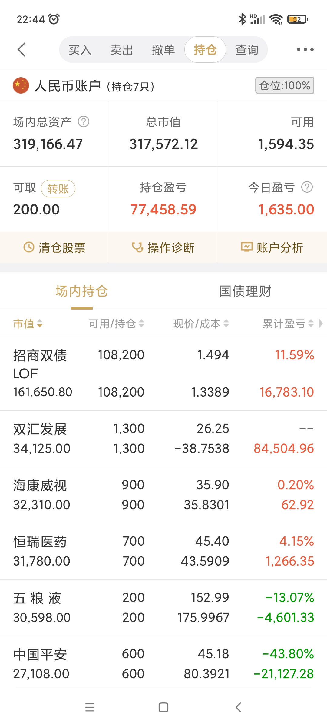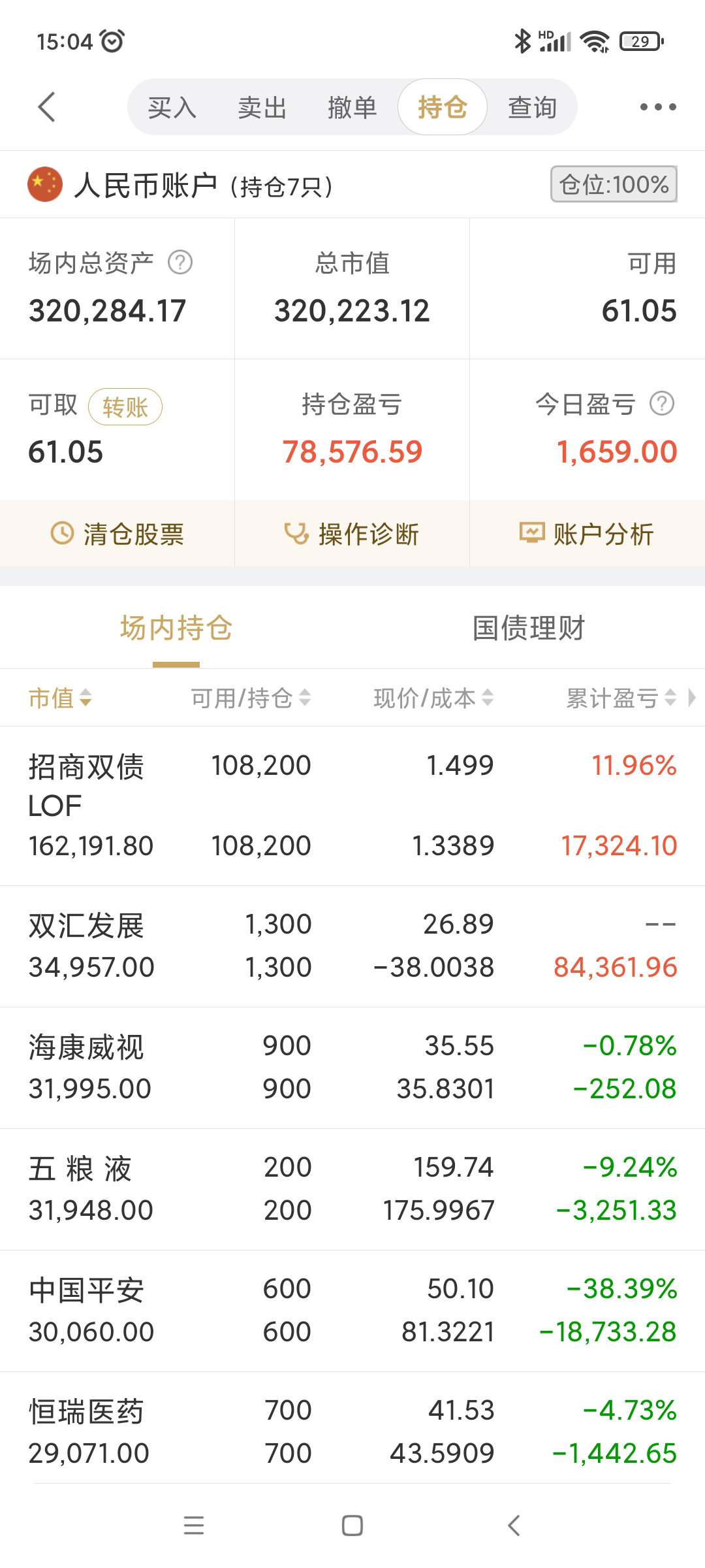 选股原因:选择中国平安是因为公司好,属于行业龙头,业绩长期向上,基本面无需置疑,被黑天鹅退市几率极小,股价具备长期向上趋势的确定性较强;选择双汇发展的原因与中国平安类似,不同之处是属于笔者的心水股,长期跟踪持有已经很多年,有感情舍不得换股。两只股票隶属上海交易所和深圳交易所各一只,配置后可以作为打新底仓。招商双债在同类基金里面属于排名前10,选它最重要的因素是场内交易量较大,流动性不存在问题;