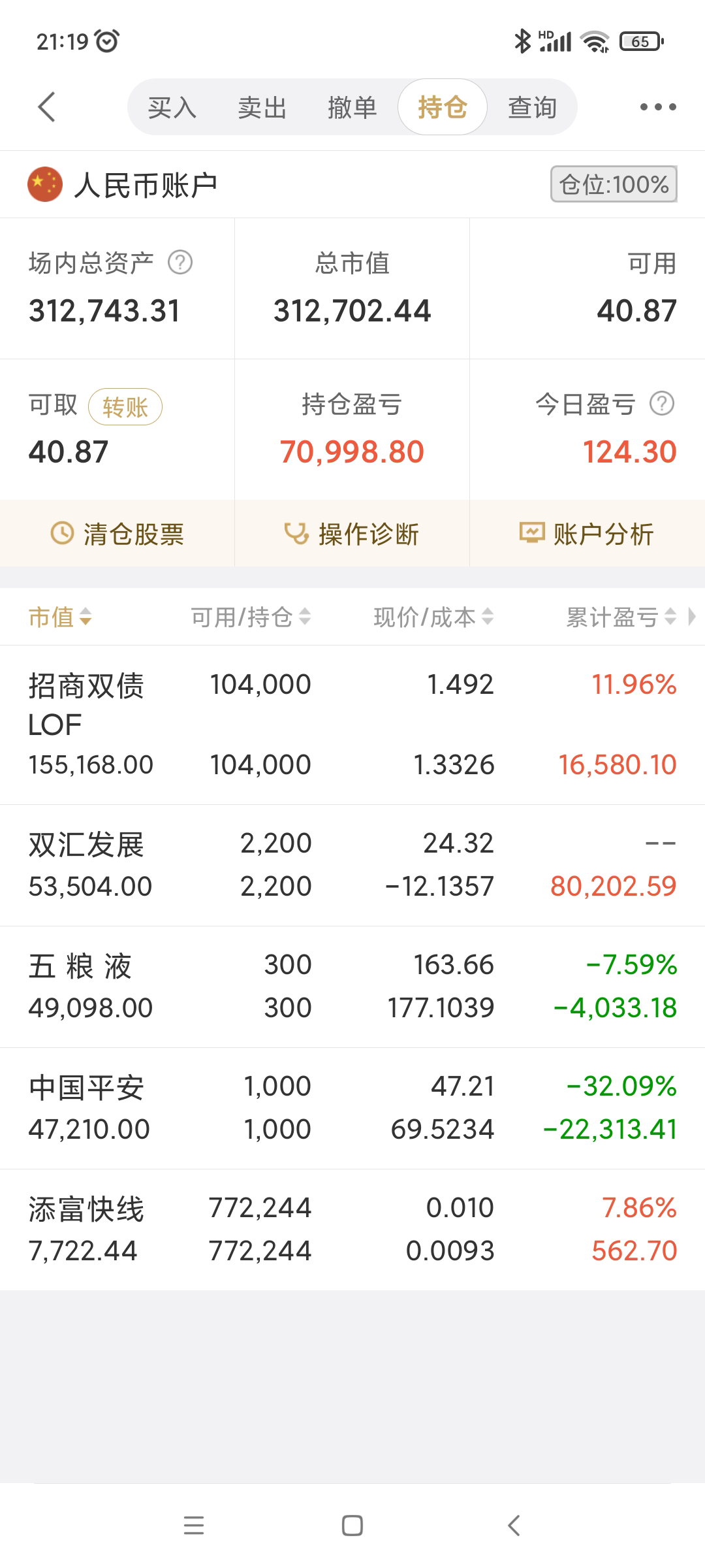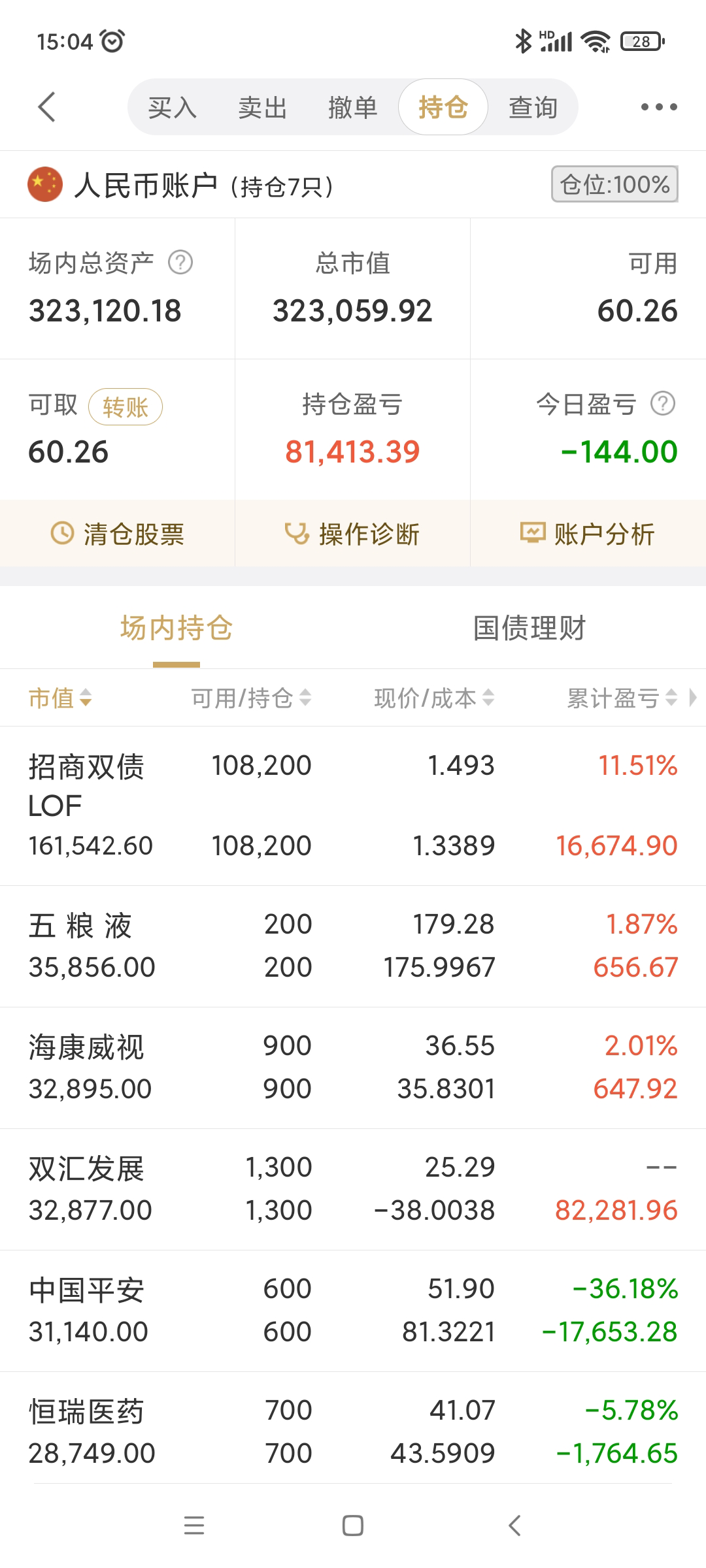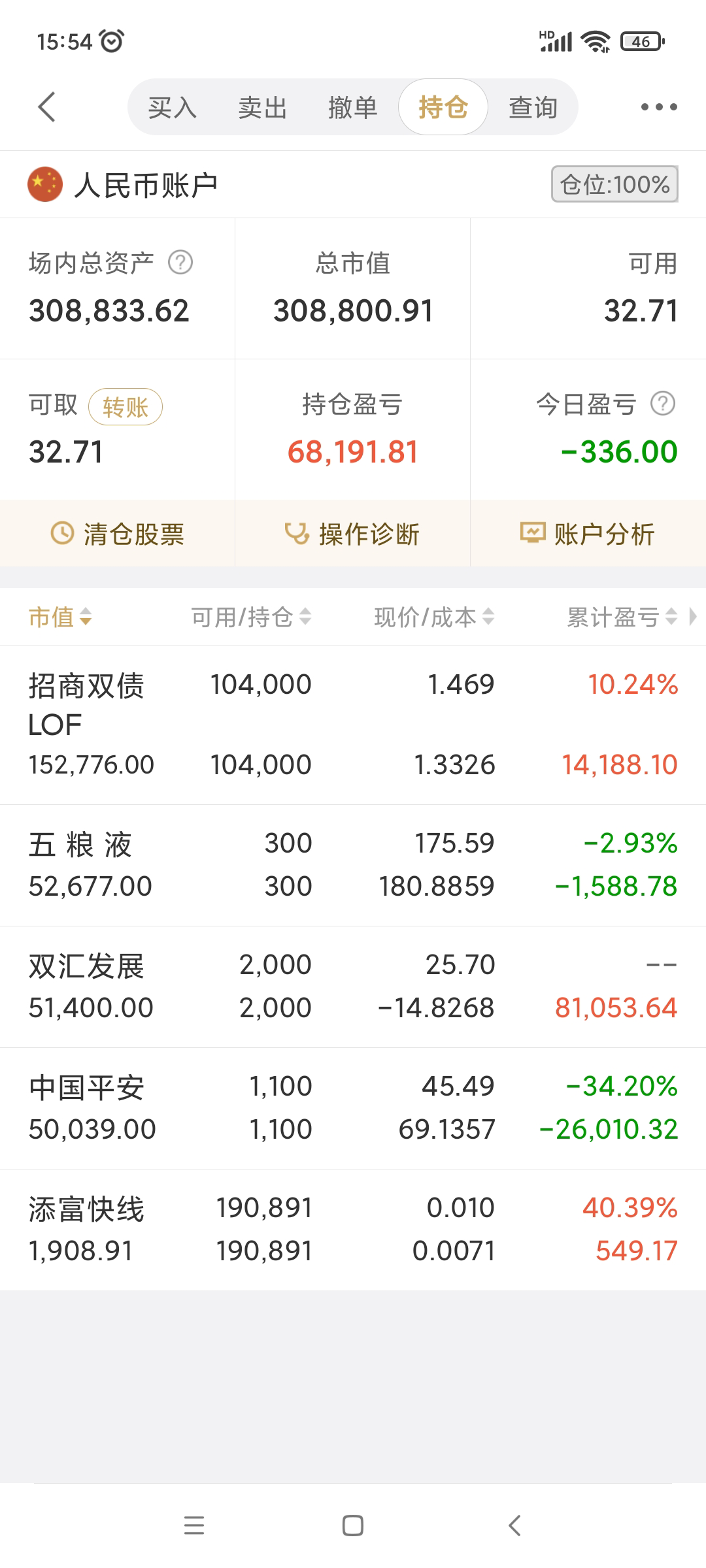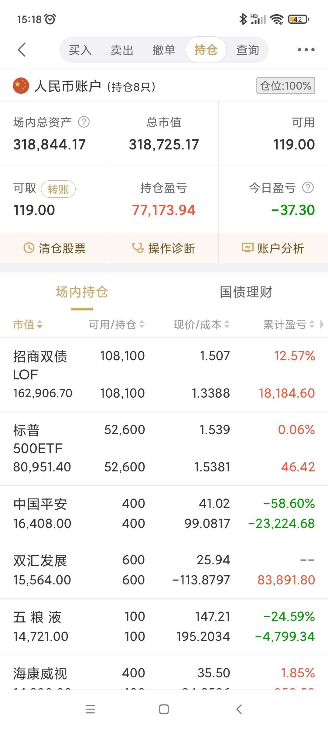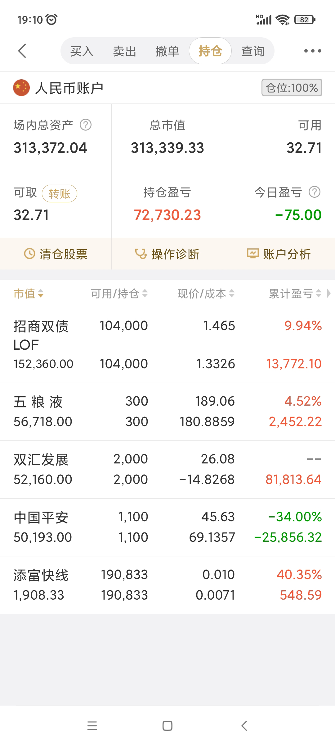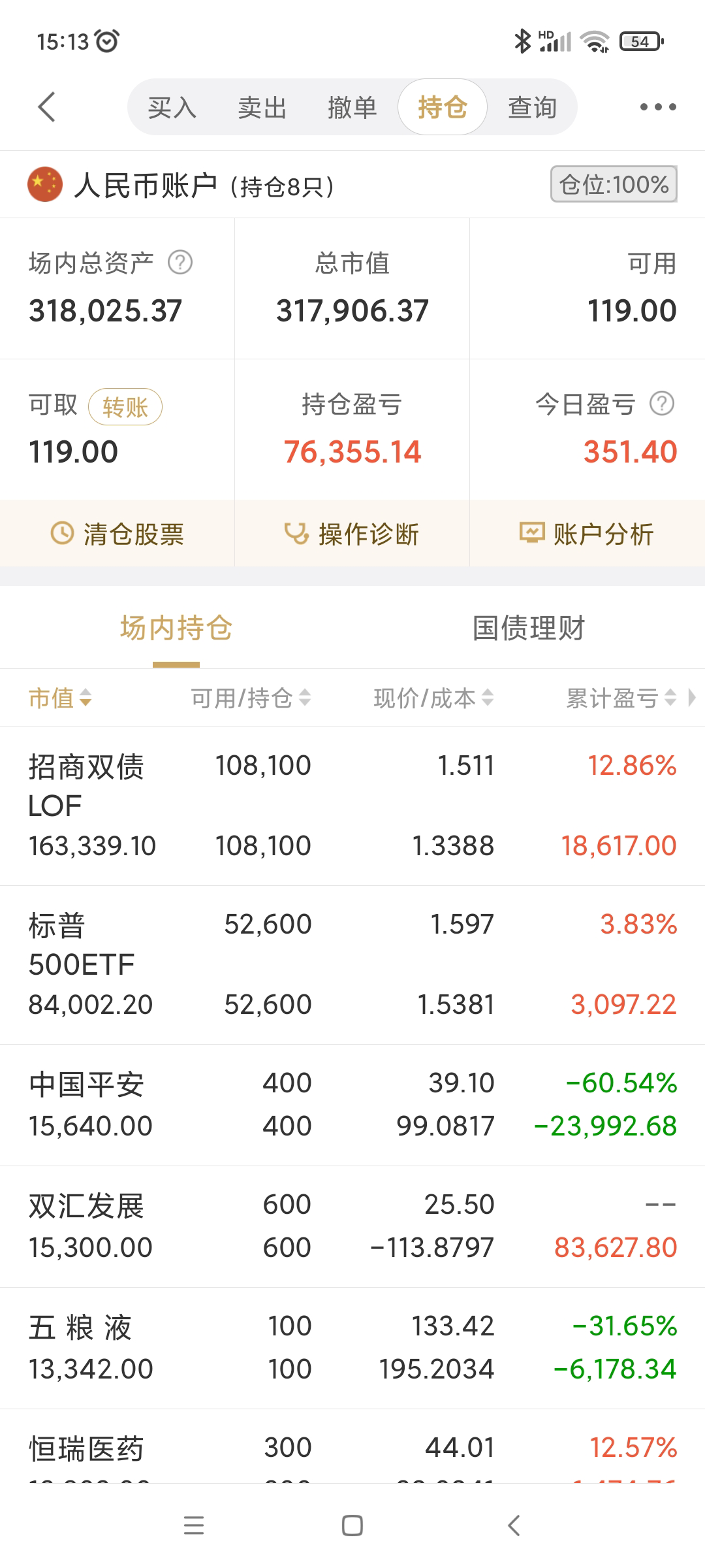选股原因:选择中国平安是因为公司好,属于行业龙头,业绩长期向上,基本面无需置疑,被黑天鹅退市几率极小,股价具备长期向上趋势的确定性较强;选择双汇发展的原因与中国平安类似,不同之处是属于笔者的心水股,长期跟踪持有已经很多年,有感情舍不得换股。两只股票隶属上海交易所和深圳交易所各一只,配置后可以作为打新底仓。招商双债在同类基金里面属于排名前10,选它最重要的因素是场内交易量较大,流动性不存在问题;