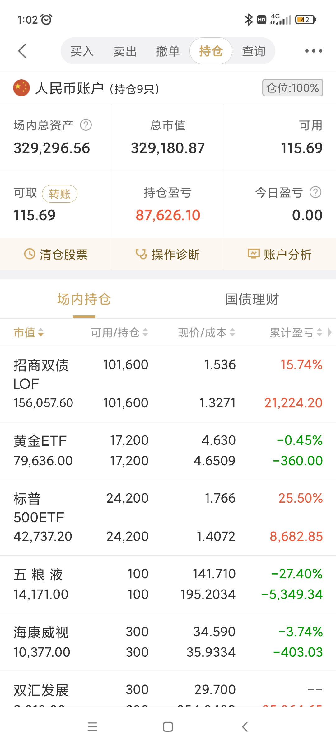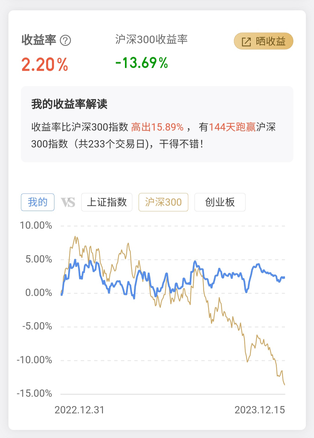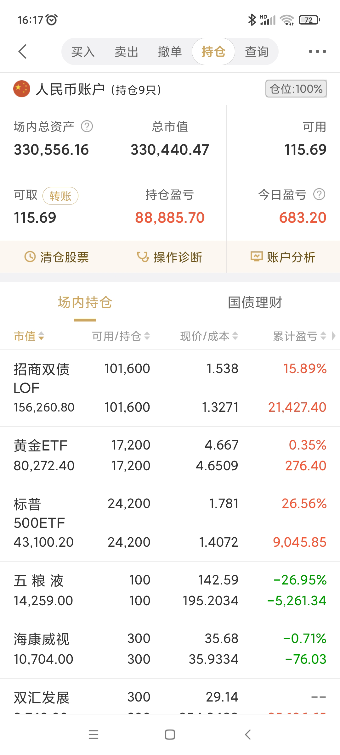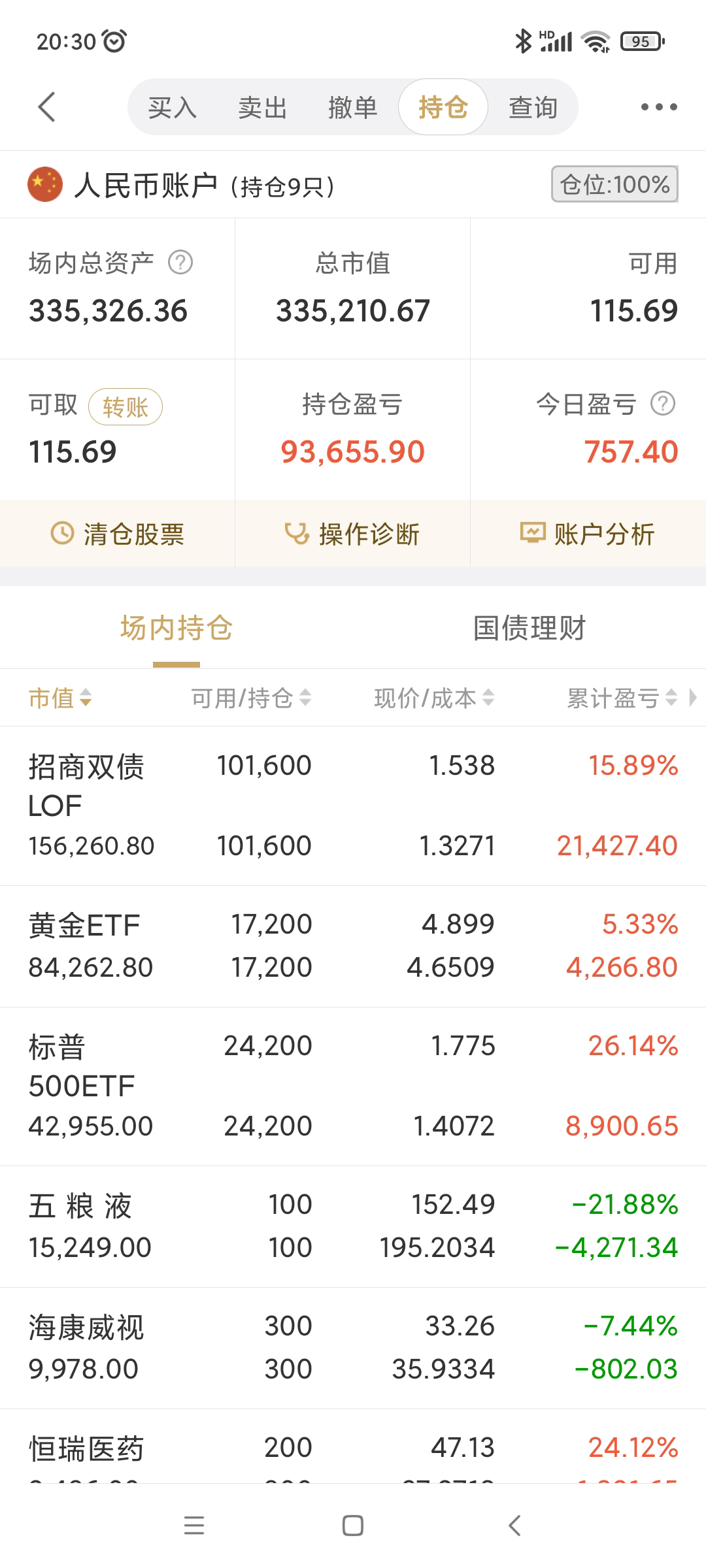 才看到这个帖子,请教楼主几个问题:1、选择的个股标的目前看上去考虑了不相关性,避免风险。为什么不选择沪深300VS组合债,标普500VS美组合债?目前看仍然有少量个股风险。2、黄金属于商品部分,在通胀和避险逻辑下。和A股的盈利逻辑、美股的利率逻辑不是一条线的,用于组合内貌似承担了“股”的部分,是什么考虑?3、之后是否会考虑因行情调整股债比例?还是绝对5:5?没有那么多严谨的思考,只是维持股票:债券各一半的随意调仓罢了,今年收益已经上了,不考虑其他调仓策略。