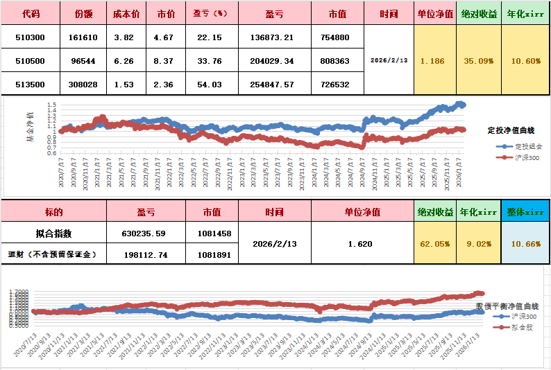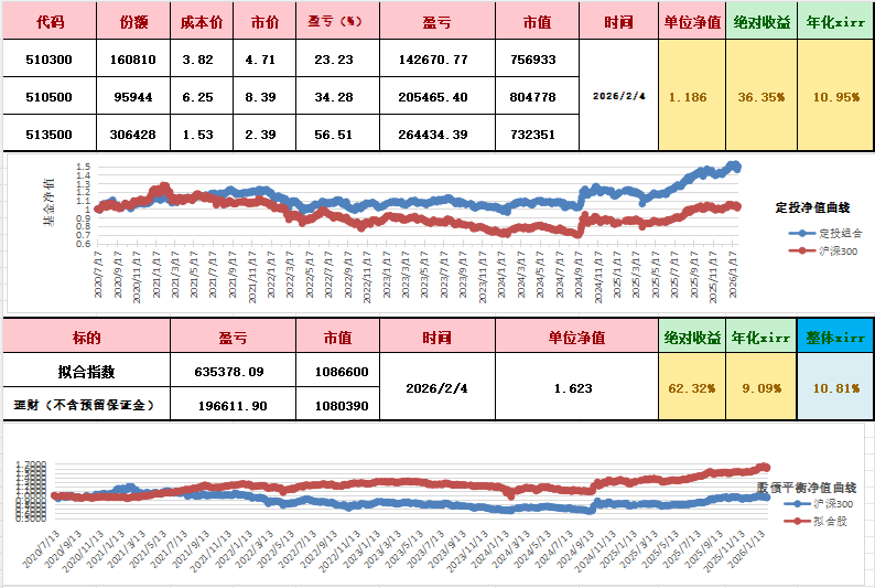 补充记录,2026年1月9日,盘中触及再平衡阈值,卖出市值大约113780的股,同时买入113780市值的债。这是第十二次再平衡操作。加上第一轮定投盈利,目前大约8.6年时间,xirr10.87%。