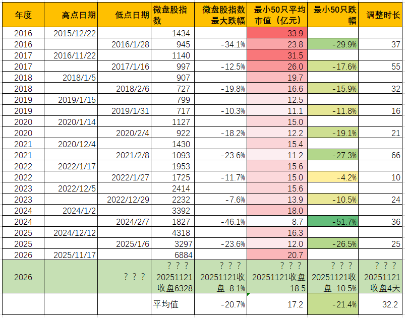 目前微盘股的调整幅度-8.1%,离平均值-20.7%还有距离,