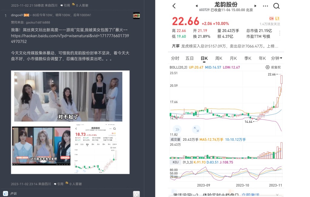如何卖涨停股太难!---+-----+-----+-----+-----+-----+-----+-----+-----+-----+-----+-----+-----+第一个涨停板卖出的龙韵股份,居然三连板了,稍微有点不爽。每当我持有等连板的时候,一般都会吃高开低走大阴线。当我提前撤退的时候,连板就来了。如何卖出涨停股,虽然研究了很多,但是实战还是操作的很差,因为波动实在太大,太影响心态了。还...这玩意据说是炒生效炒起来的 明年是龙年