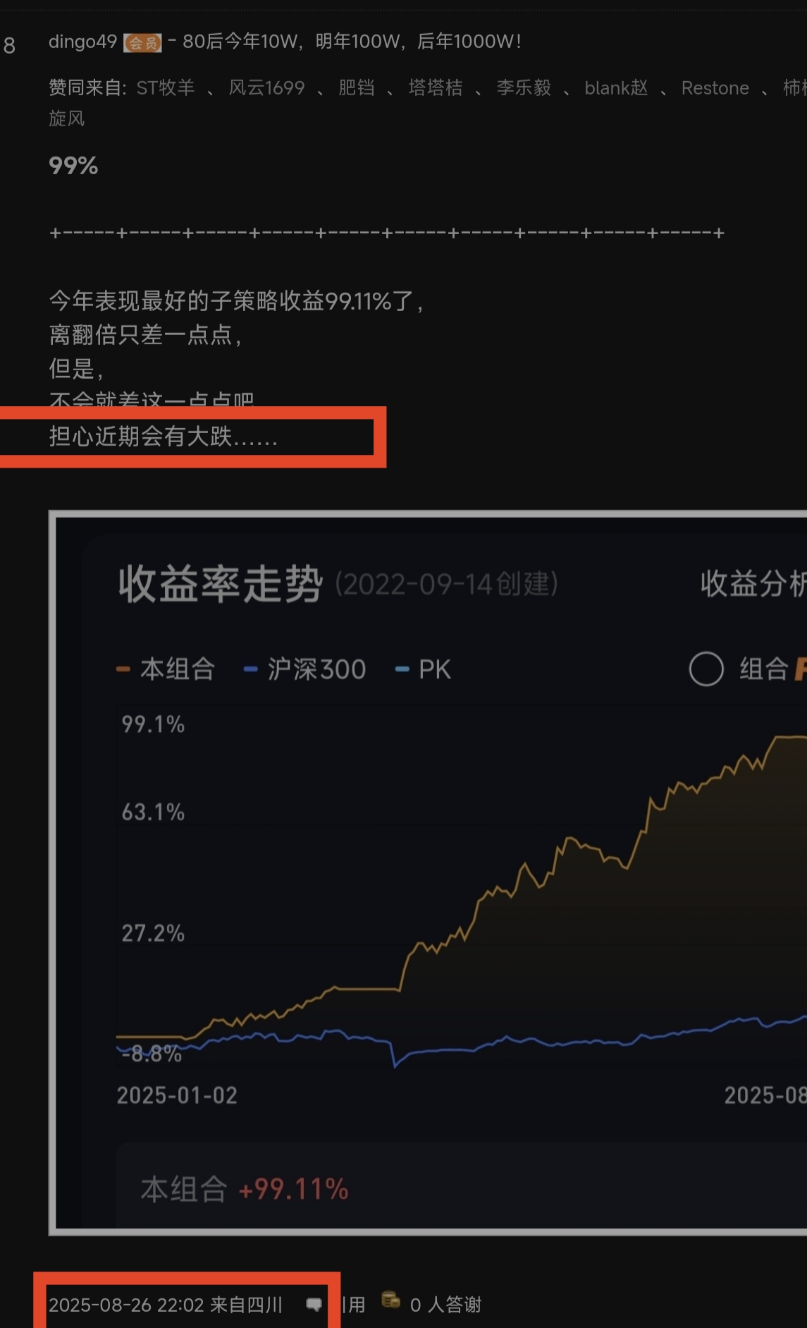 99%+-----+-----+-----+-----+-----+-----+-----+-----+-----+-----+今年表现最好的子策略收益99.11%了,离翻倍只差一点点,但是,不会就差这一点点吧……担心近期会有大跌……