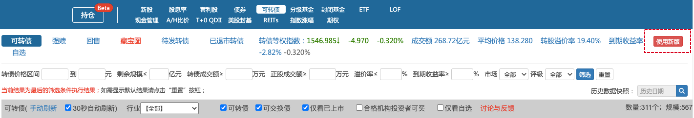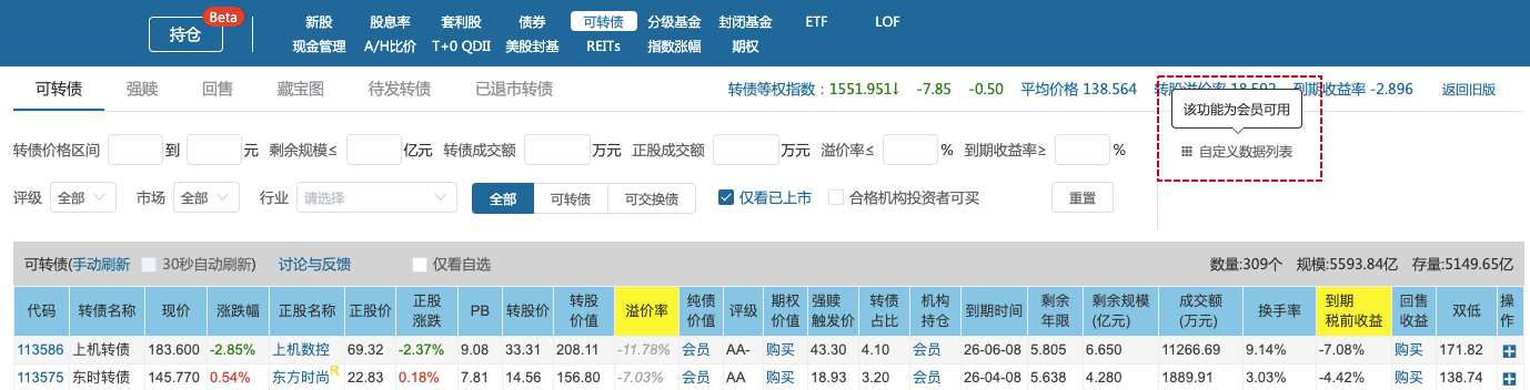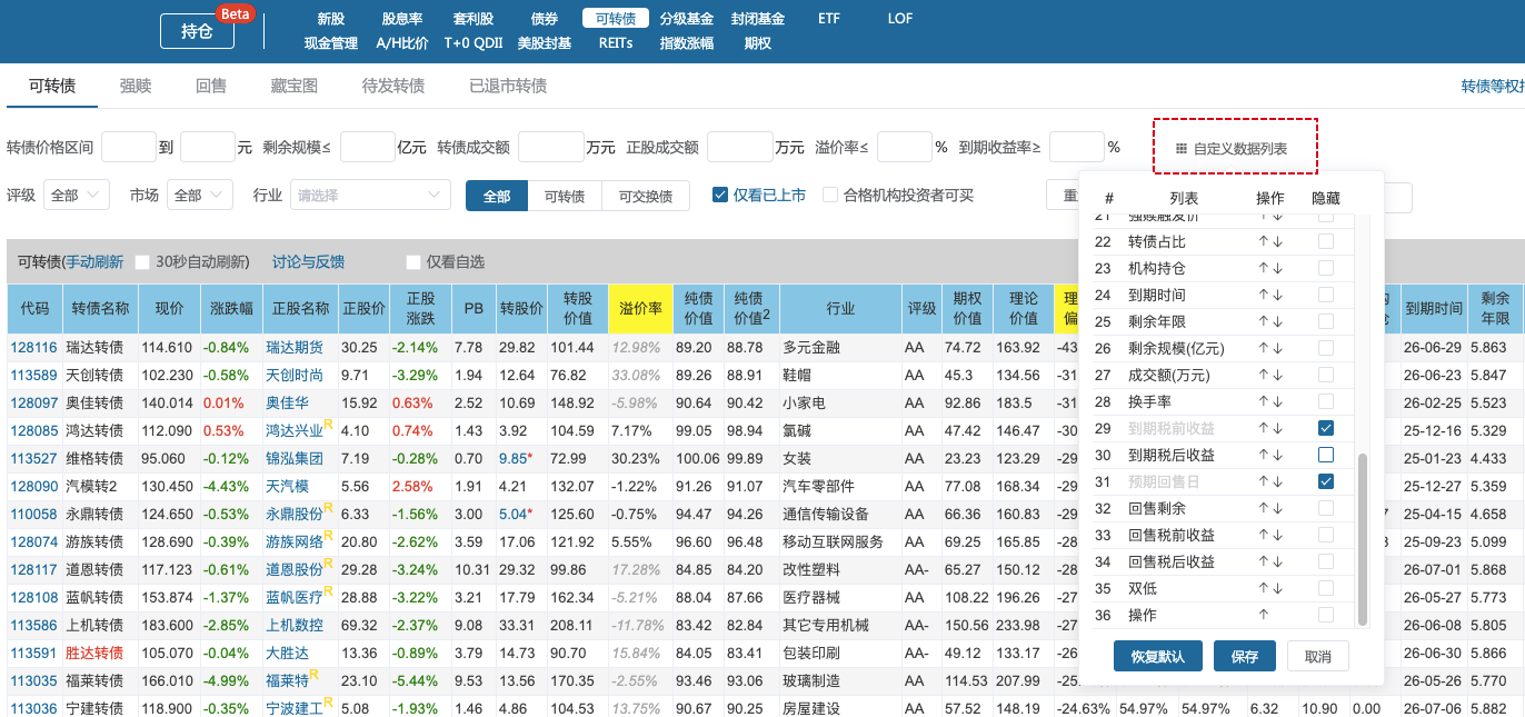 那谁...谁...谁...提出建议,期望可转债的大列表页可以自定义页面显示的字段和排列顺序,需求一句话,程序员折腾、调试,新增了行业、税后收益的数据,最终呈现的效果如下图所示 进入定制版