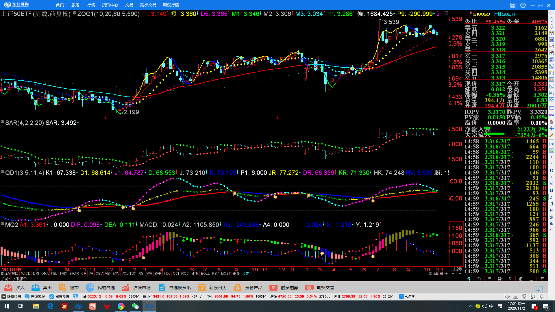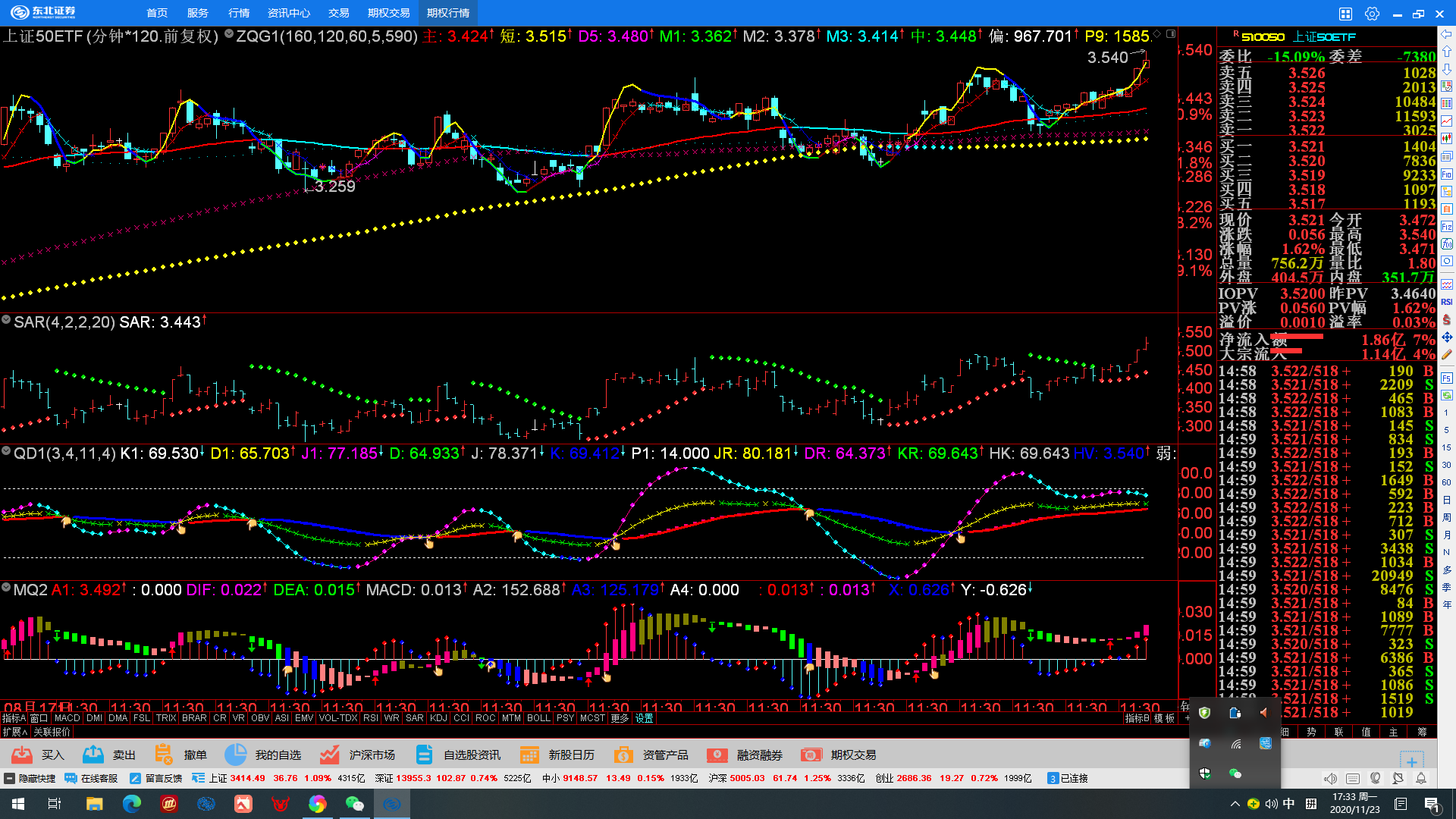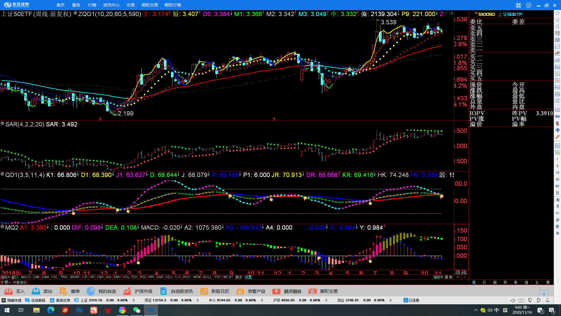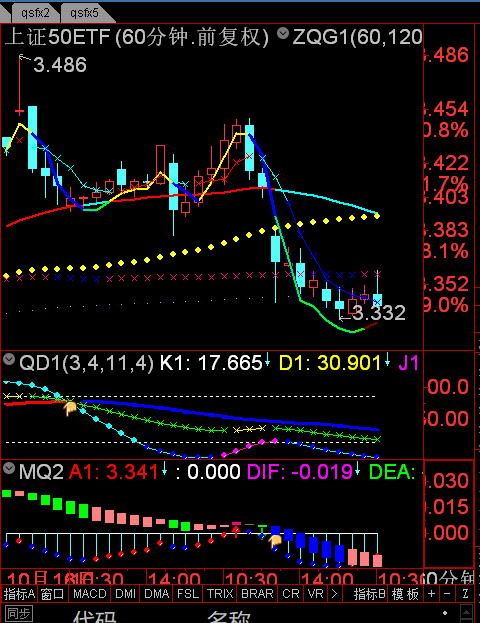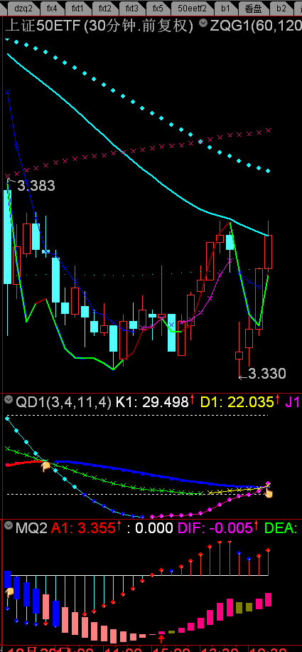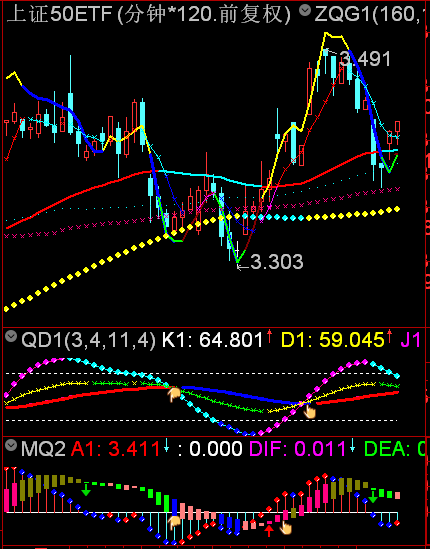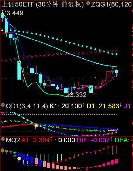 @缓慢投资 从7月以来50ETF都是在3.2-3.5内做箱型运行,所以就选择了网格交易。注意(卖方为主)网格交易一定要控制仓位,一是规避出现破箱后大升或大跌时(升波)的风险,二是此时才有足够的仓位再加。我同时会参考两个指标,就是主图的轨道指标,这个指标比较敏感和副图1的不敏感KDJ指标。轨道指标从博弈系统改编而来。不敏感KDJ的理念来自"莫大"。
