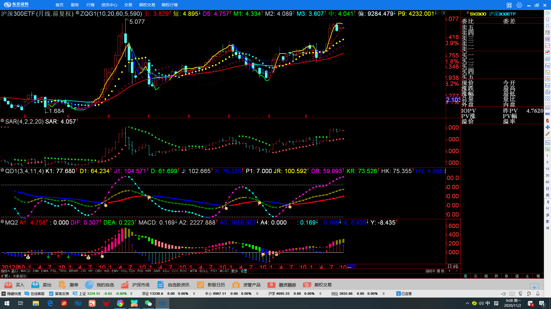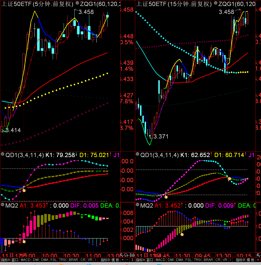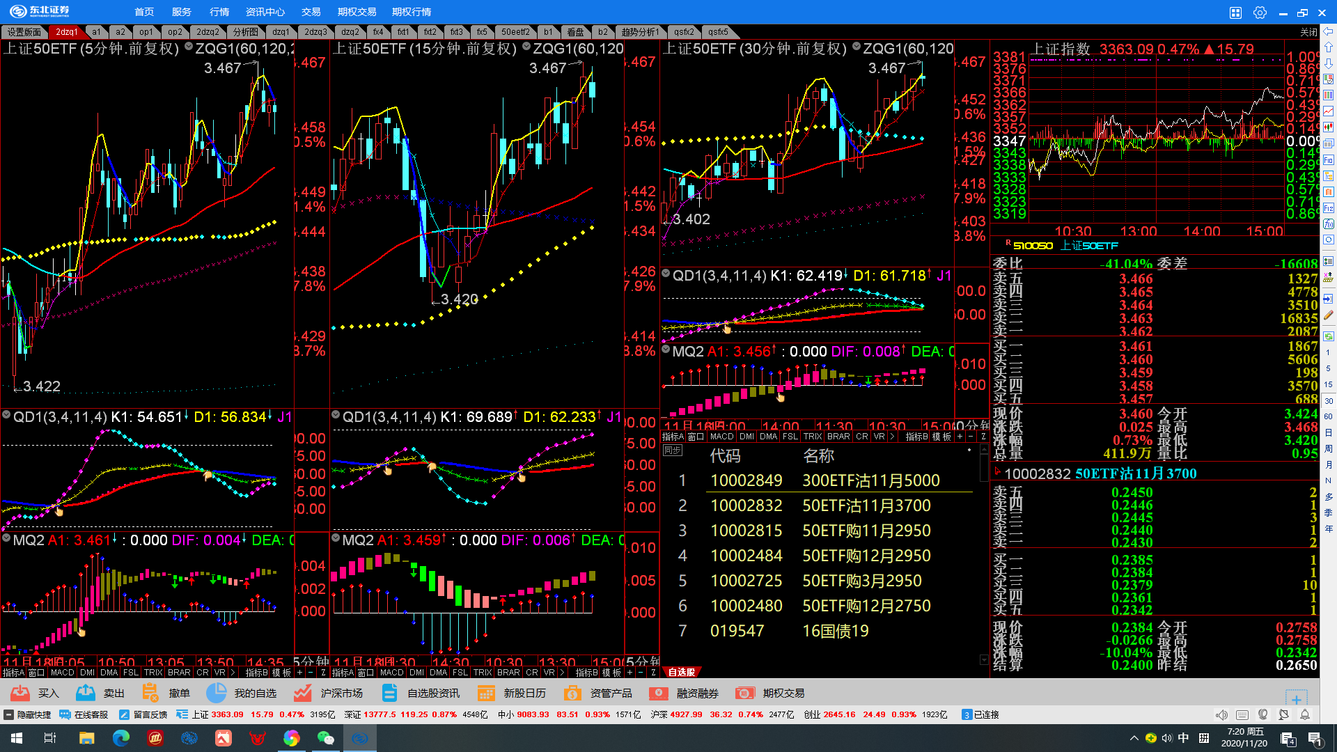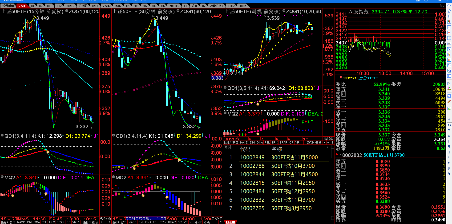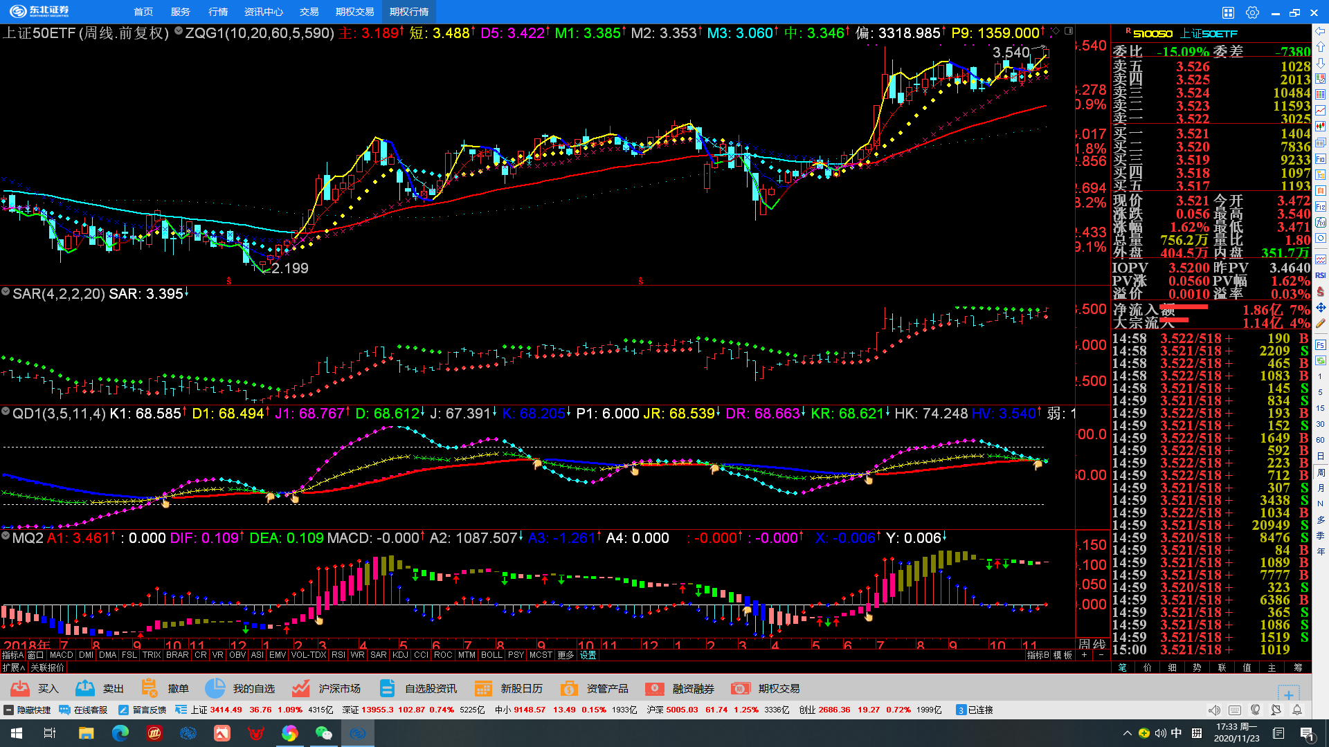 @缓慢投资 从7月以来50ETF都是在3.2-3.5内做箱型运行,所以就选择了网格交易。注意(卖方为主)网格交易一定要控制仓位,一是规避出现破箱后大升或大跌时(升波)的风险,二是此时才有足够的仓位再加。我同时会参考两个指标,就是主图的轨道指标,这个指标比较敏感和副图1的不敏感KDJ指标。轨道指标从博弈系统改编而来。不敏感KDJ的理念来自"莫大"。