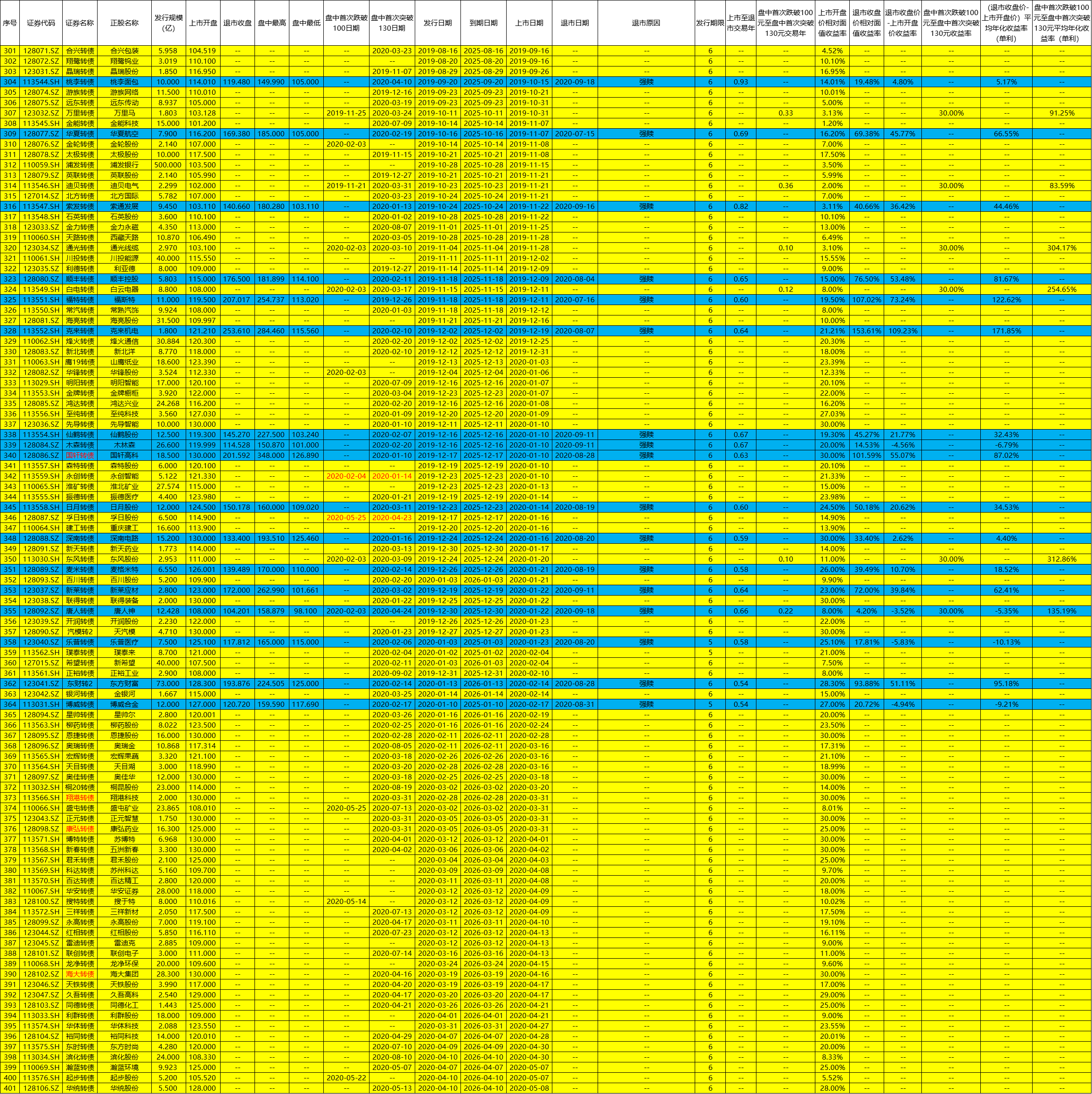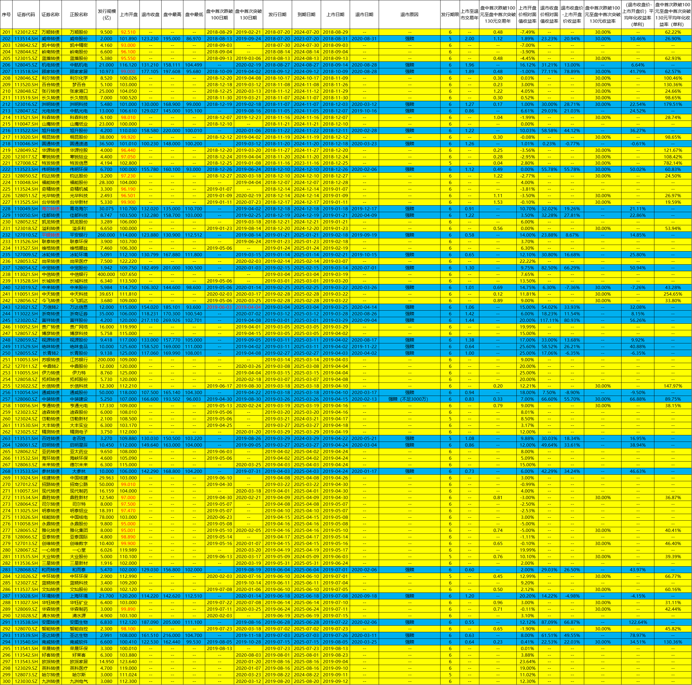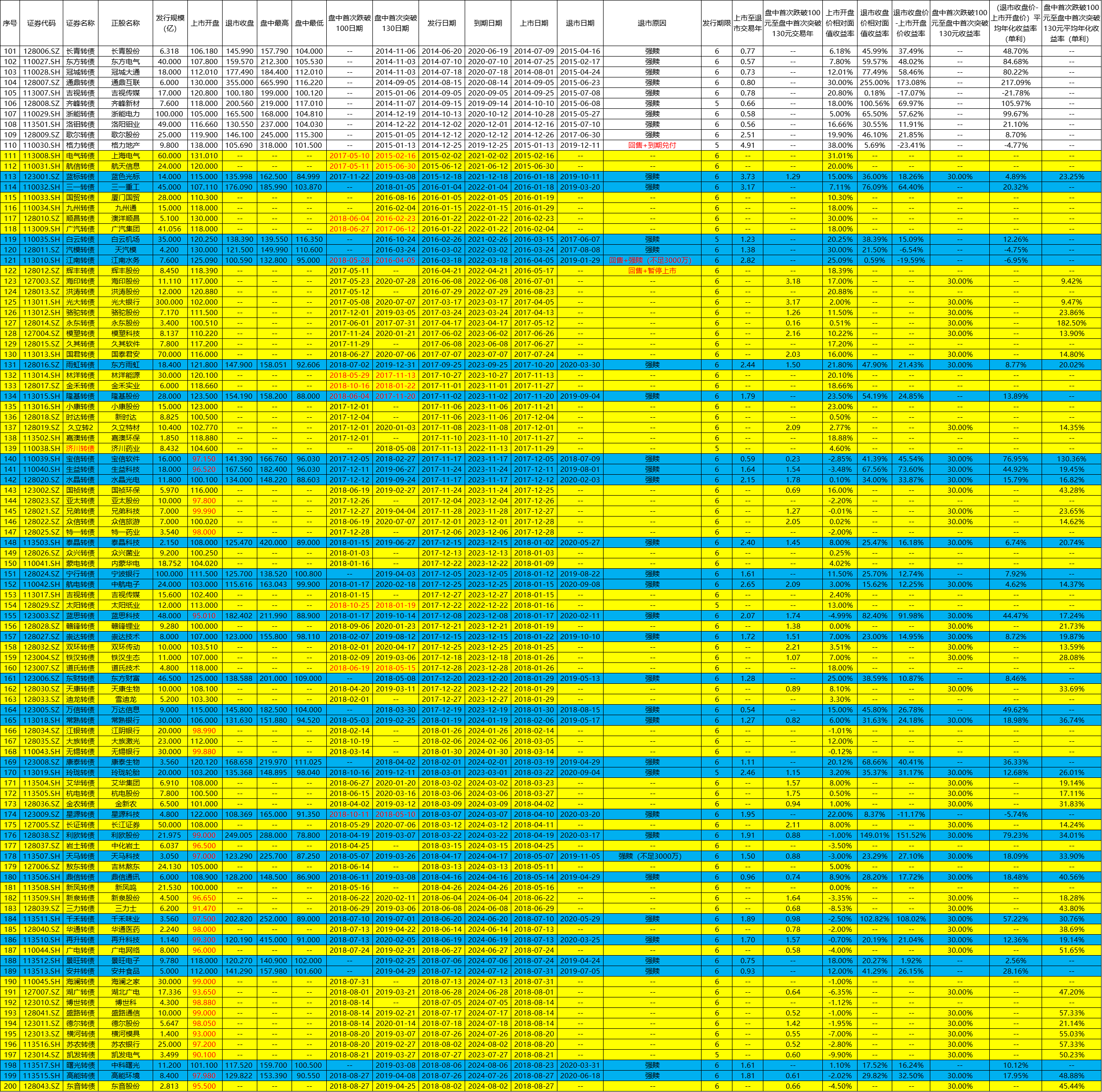 6、普通色为已退市转债,黄色为尚未退市转债,蓝色为2015后发行已退市转债,浅绿色为尚未上市交易转债;红色字体名称的转债其强赎条款不是130%。