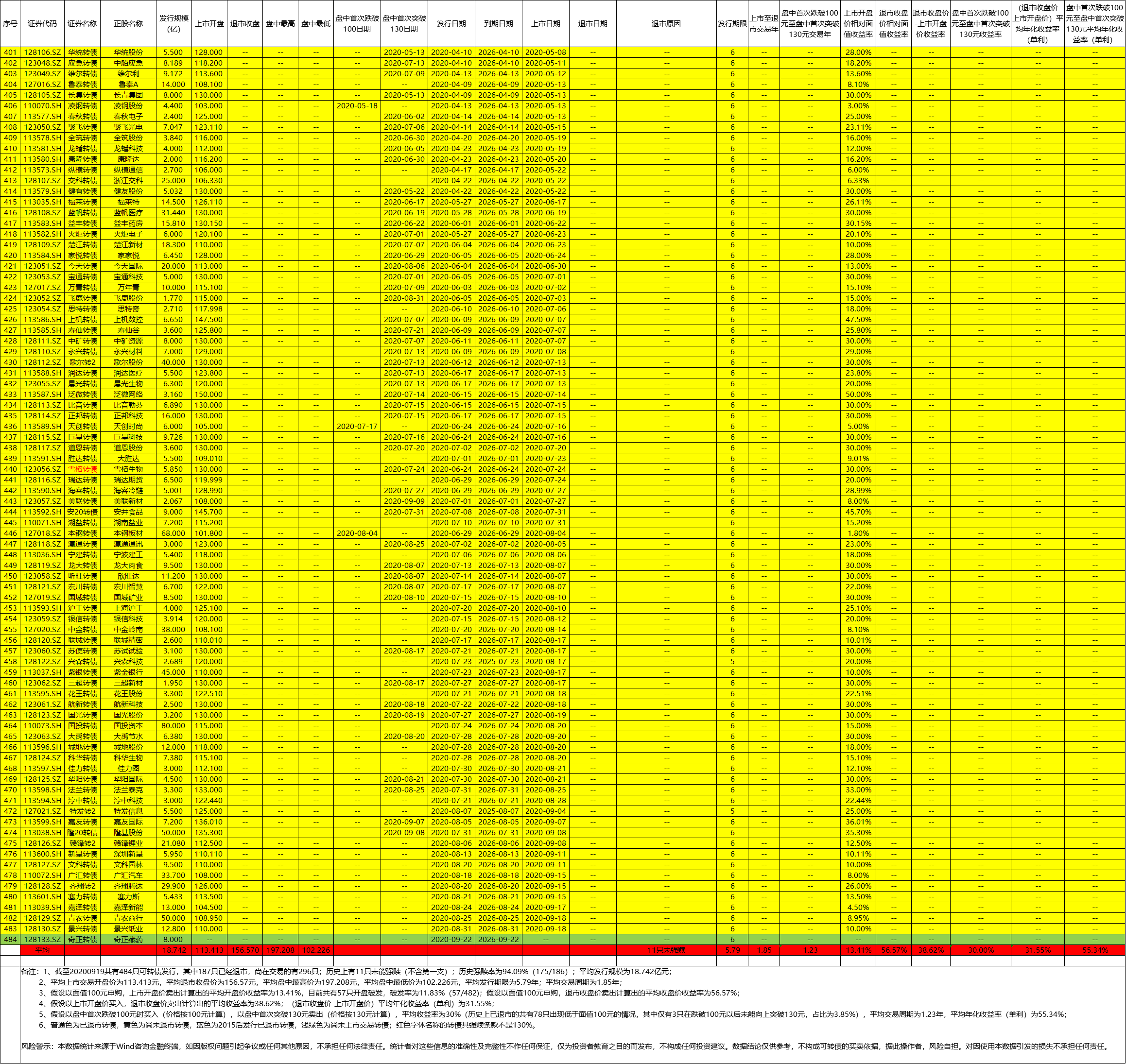 1、截至20200919共有484只可转债发行,其中187只已经退市,尚在交易的有296只;历史上有11只未能强赎(不含第一支);历史强赎率为94.09%(175/186);平均发行规模为18.742亿元;