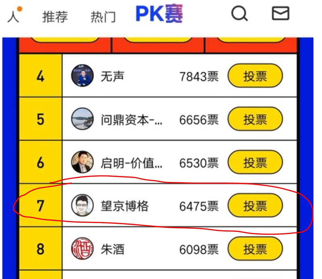 投票方式:雪球app主页——PK赛——找到“望京博格”——连击三下(每人每天最高可投三票,分享可投四票)