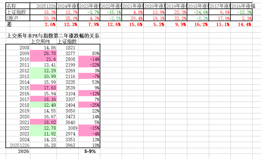 展望2025,观察"上交所年末PE与指数第二年涨跌幅的关系",2024年很像2019年,如果2025年很像2020年,那么上证指数2025年预期有14%涨幅,那么“afg的投资系统”S账户就应该像2024一样有25%涨幅,,,
