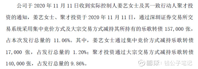 乐歌转债全天成交11.97亿元,是1.42亿元发行规模的8倍多。盘后,乐歌股份发布公告:乐歌股份实际控制人姜艺以及一致行动人聚才投资,于11月11日减持乐歌转债157,000张,占本次发行总量的11.06%。其中,姜艺通过集中竞价方式减持17,000张;聚才投资通过大宗交易减持140,000张。
