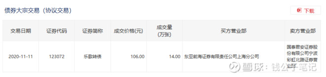 所以,今天聚才投资通过大宗交易卖出的14万张乐歌转债,成交价格才106元。