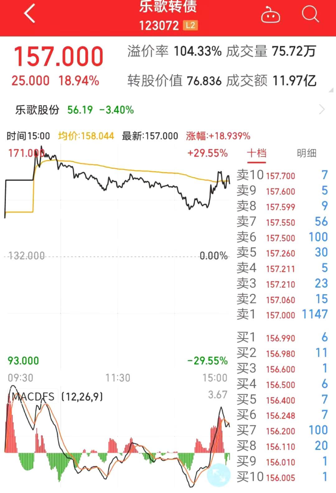 下午收盘前半小时,神秘力量突然出手,将摇摇欲坠的乐歌转债强势拉起,最终以157元收盘,溢价率高达104.33%。