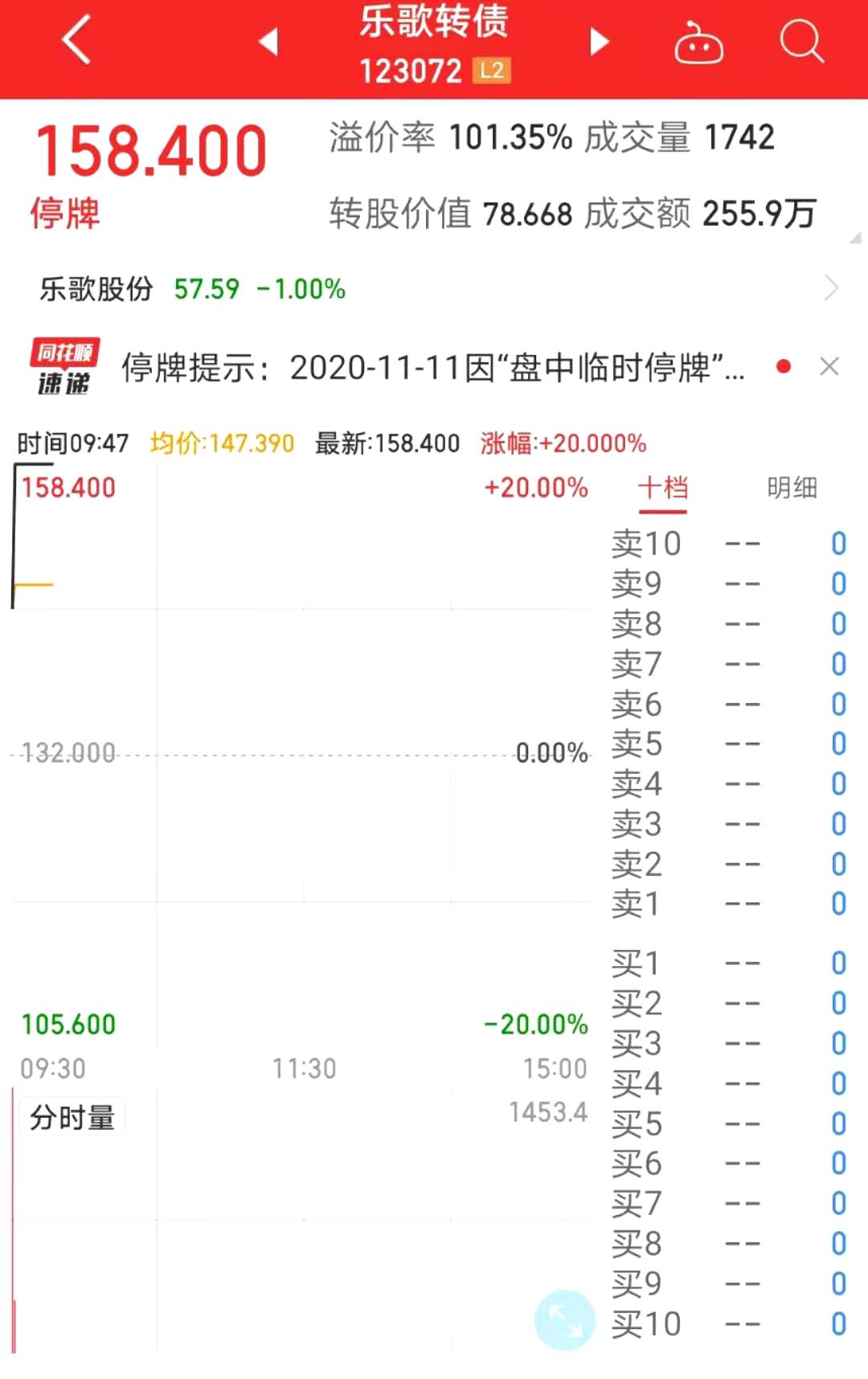 11月11日早盘集合竞价,乐歌转债在132元的基础上继续大涨10%,以145.2元开盘,集合竞价期间仅成交211万元。9:30分进入连续竞价后,仅数秒乐歌转债继续狂涨至158.4元,触发20%涨幅熔断停牌30分钟。至此,乐歌转债一共才成交了255.9万元。