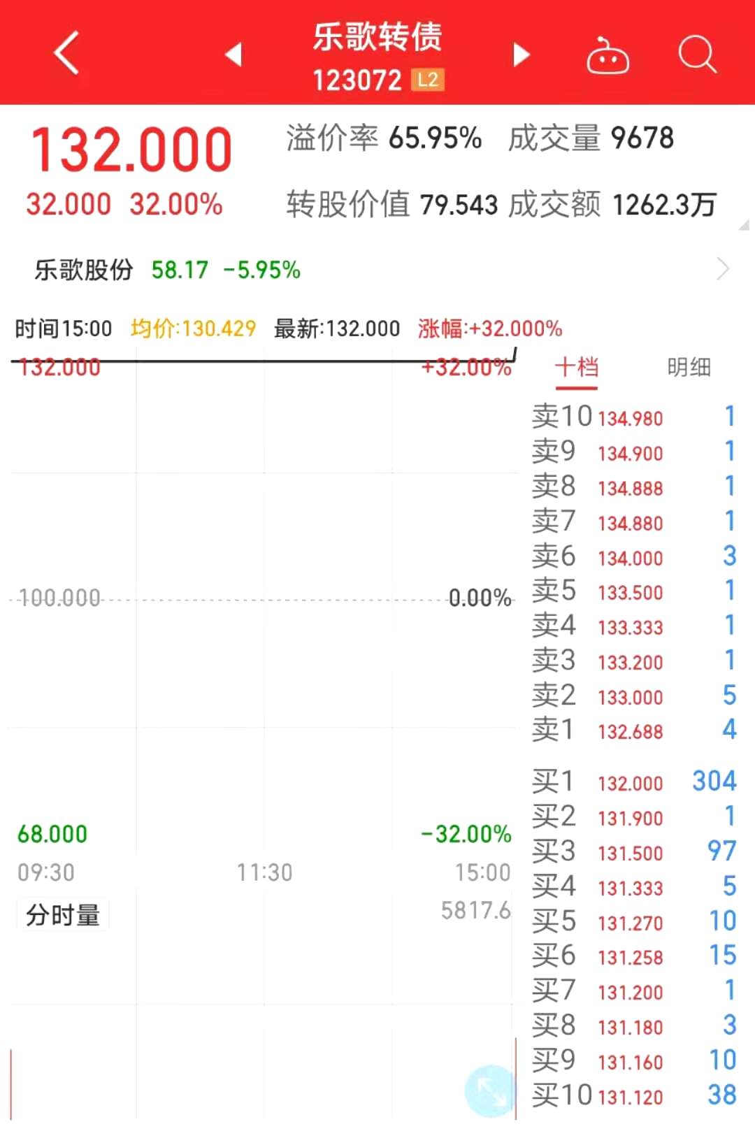 14:57分,乐歌转债复牌进入尾盘3分钟集合竞价,继续上涨以132元收盘,全天仅成交1262.3万元。当日,大股东均未通过竞价交易和大宗交易卖出。