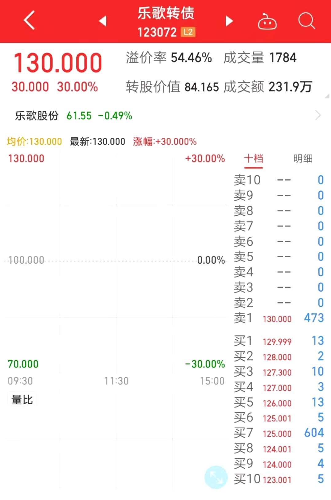 但上市当日,乐歌转债早盘集合竞价一下子就蹿上了130元,直接触发30%涨幅熔断,停牌至14:57分。早盘集合竞价仅成交了231.9万元。