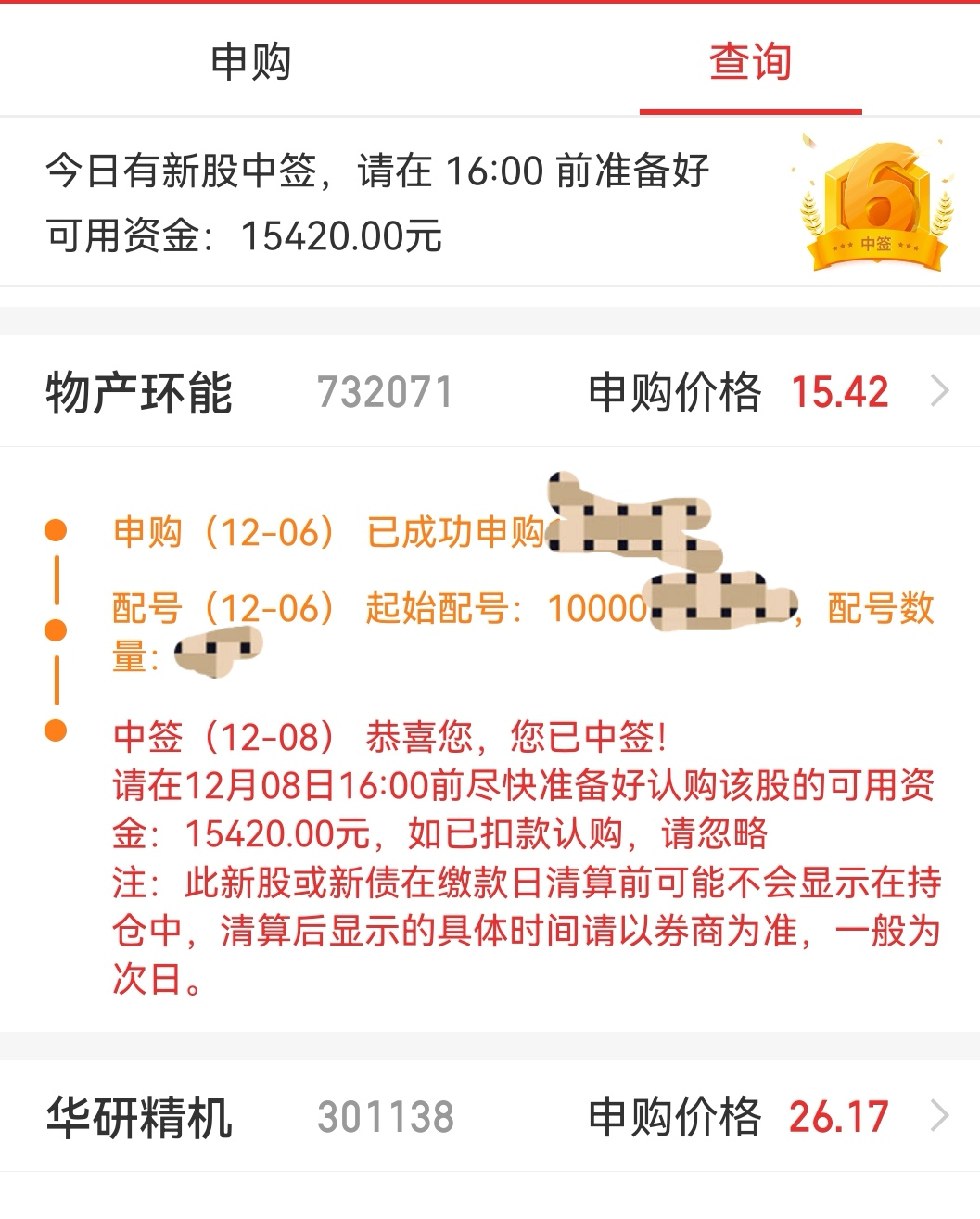 缴款中签物产环能,希望有肉。