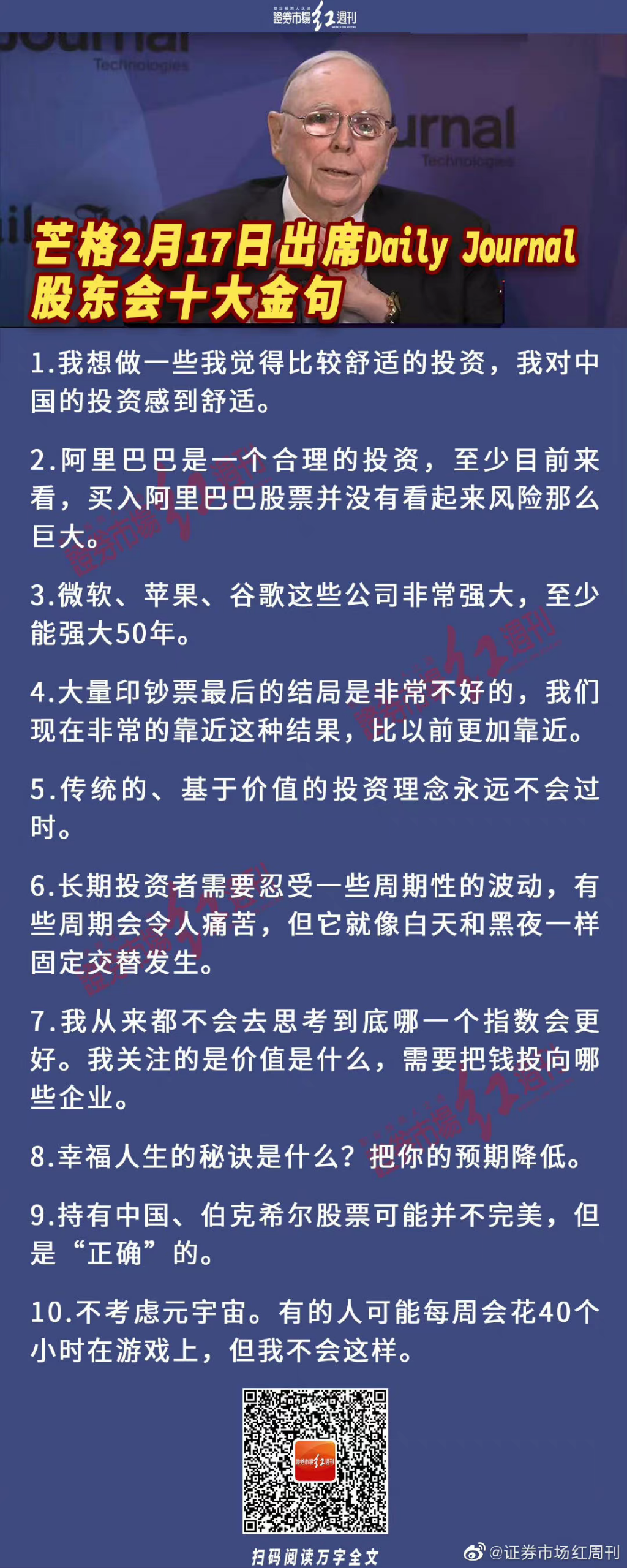 1.自我认知:投资者只要在投资市场的时间够长都会犯错,巴菲特也不例外,唯有打造适合自己的一套投资体系并不断完善才能够达到容错性;在投资的路上永远保持独立思考,用批判性思维看待事物,不断寻找长坡厚雪,从而走上滚雪球之路。