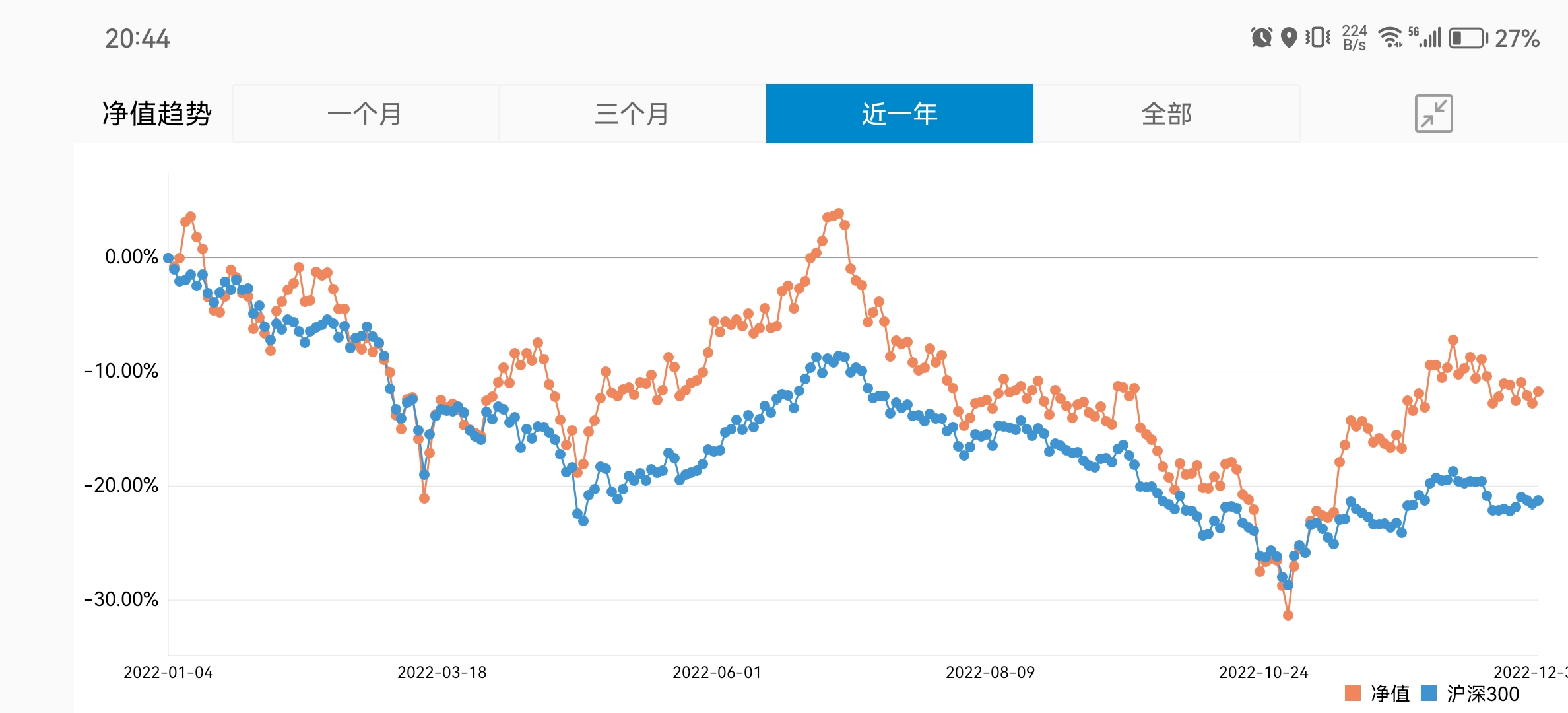 先记录下自己收益,今年自己账户统计了下-8%的水平,对于我这种几乎满仓持股的投资者,跑赢了沪深300-21.6%十几个点,也跑赢上证指数,总体评价还行!做到了熊市少亏,下一步就要做到牛市跟上了。
