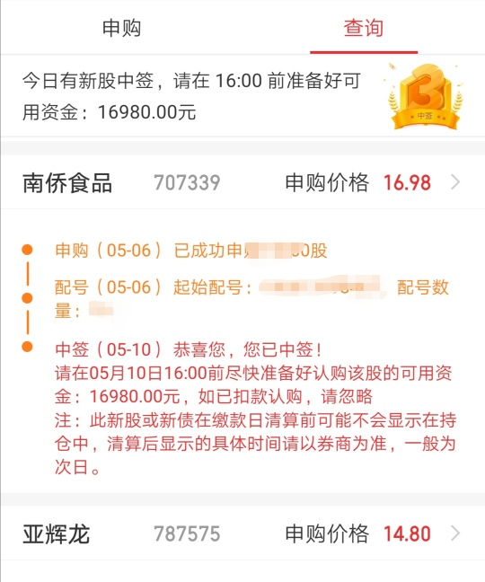 大中矿业鸡爪变猪腿,运气好,南侨食品质地不错还没开板,食品好赛道。今年中三签,按照概率完成今年的收益预期,下半年更佛系了,其他账户没这么好运气,都不急。