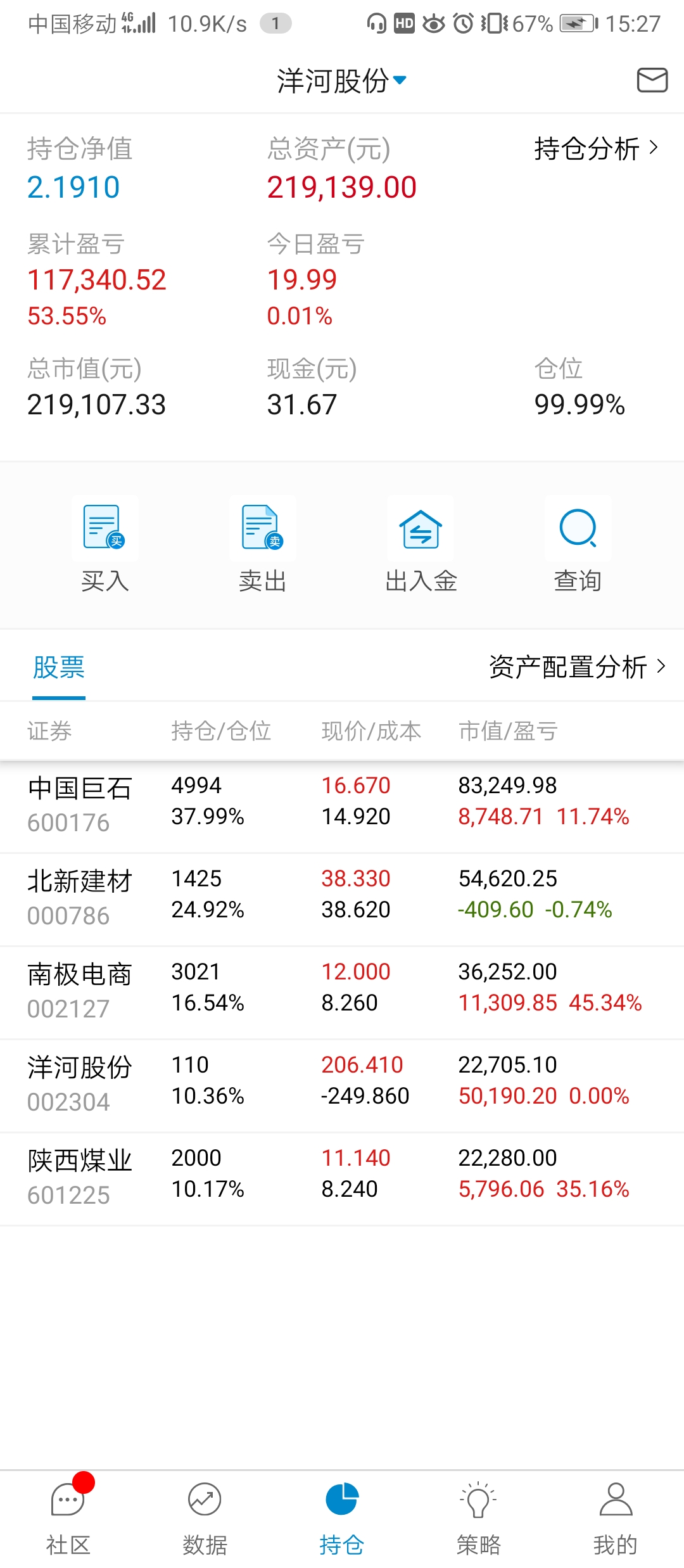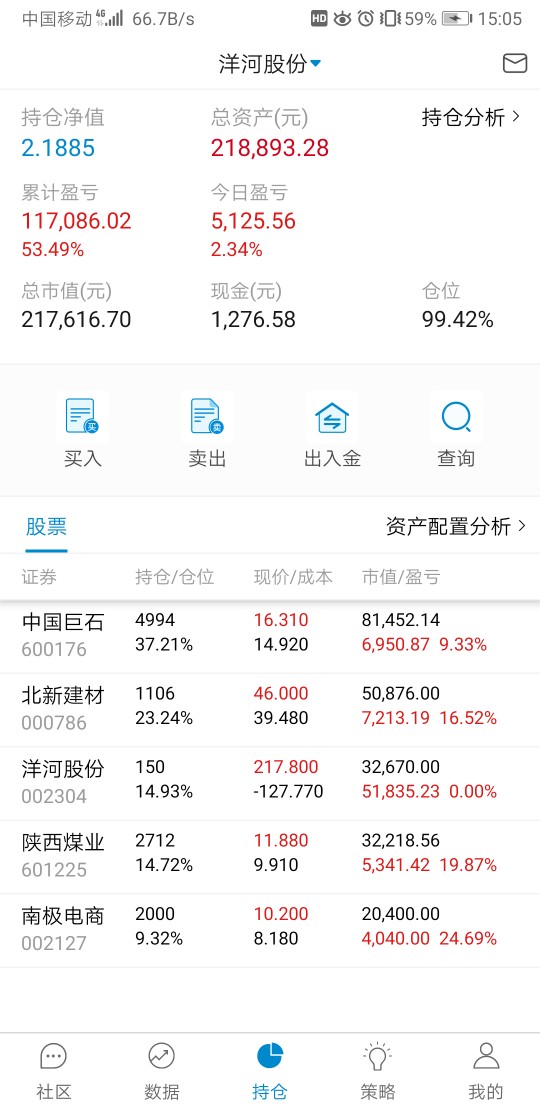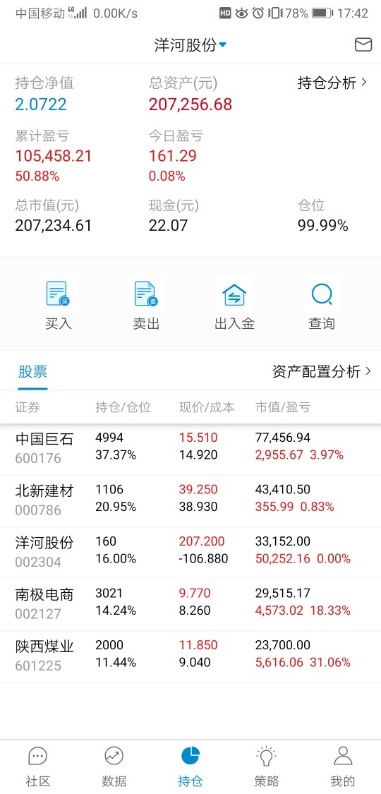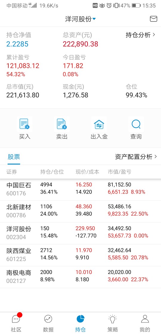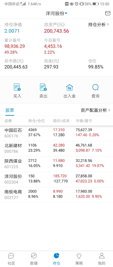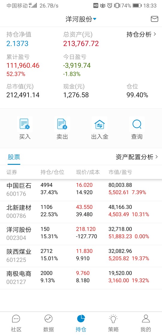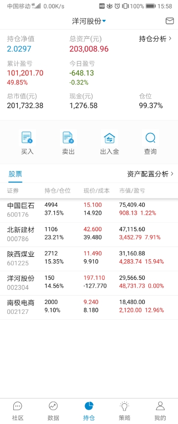 单位搬家,忙活了好几天,有空记录一下,本周应该就操作一次,减洋河加北新建材,洋河,陕煤都分红的钱没加仓,原本预定买陕煤,需要用钱周一准备转出分红家用。