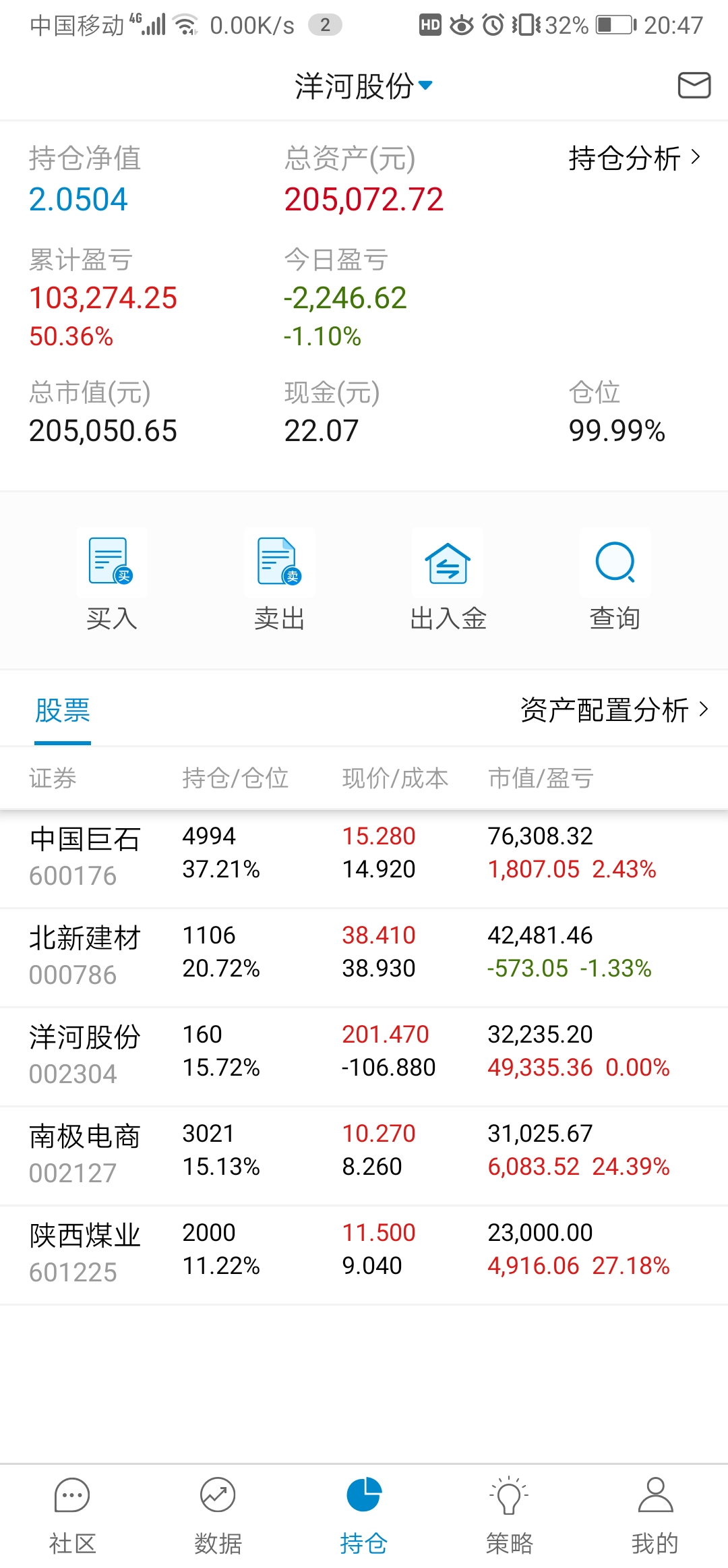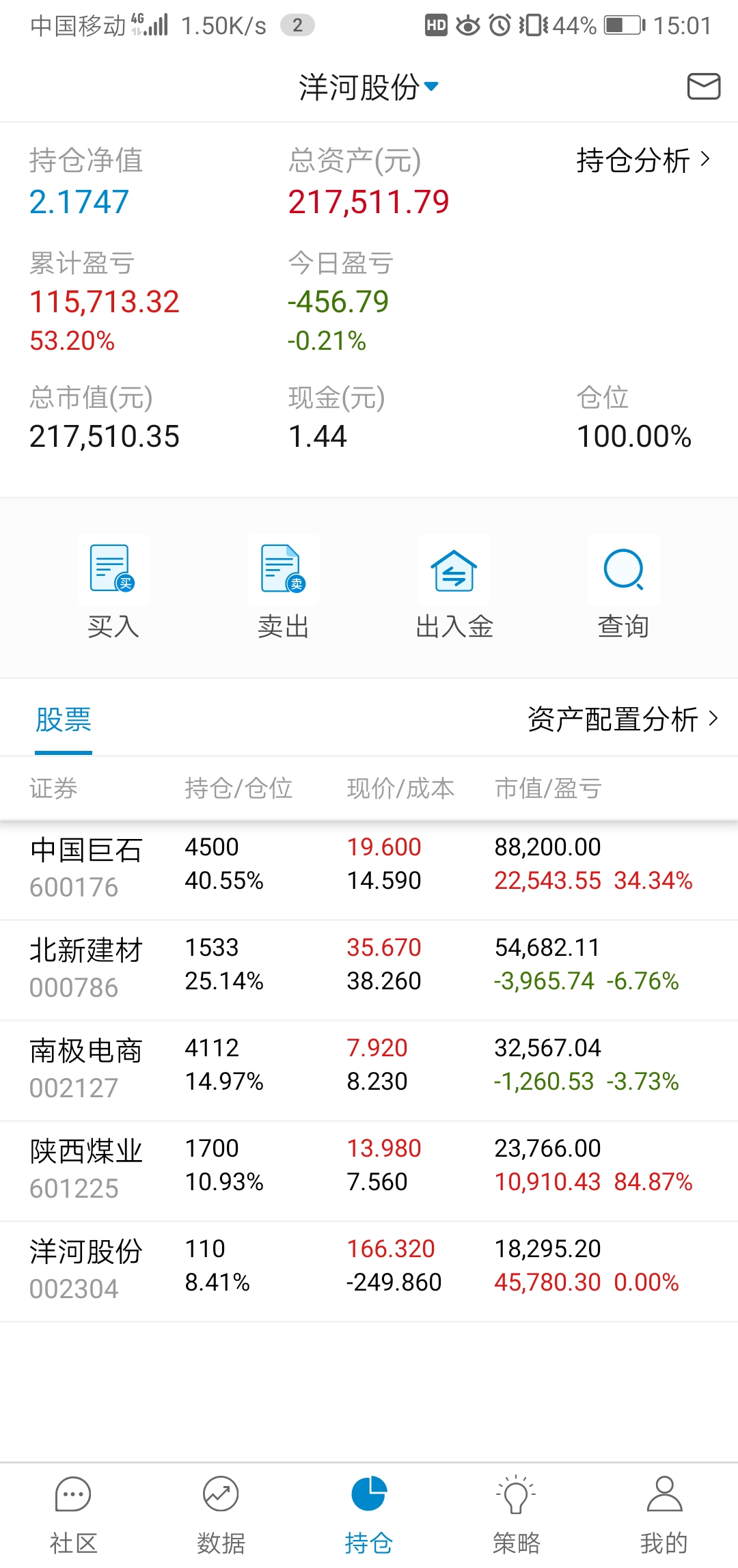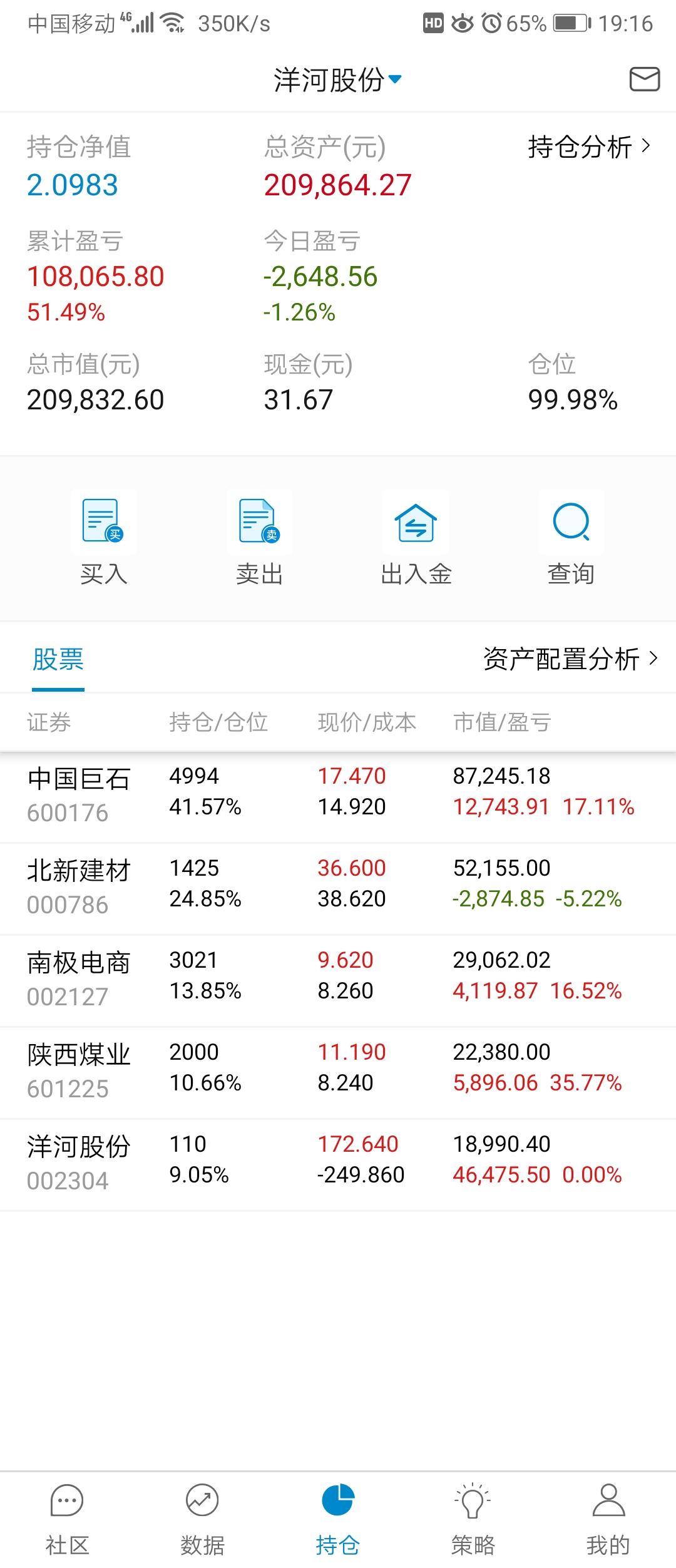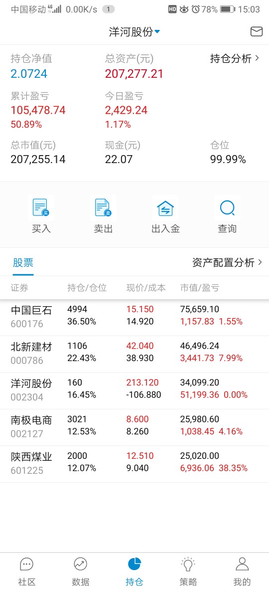 单位搬家,忙活了好几天,有空记录一下,本周应该就操作一次,减洋河加北新建材,洋河,陕煤都分红的钱没加仓,原本预定买陕煤,需要用钱周一准备转出分红家用。