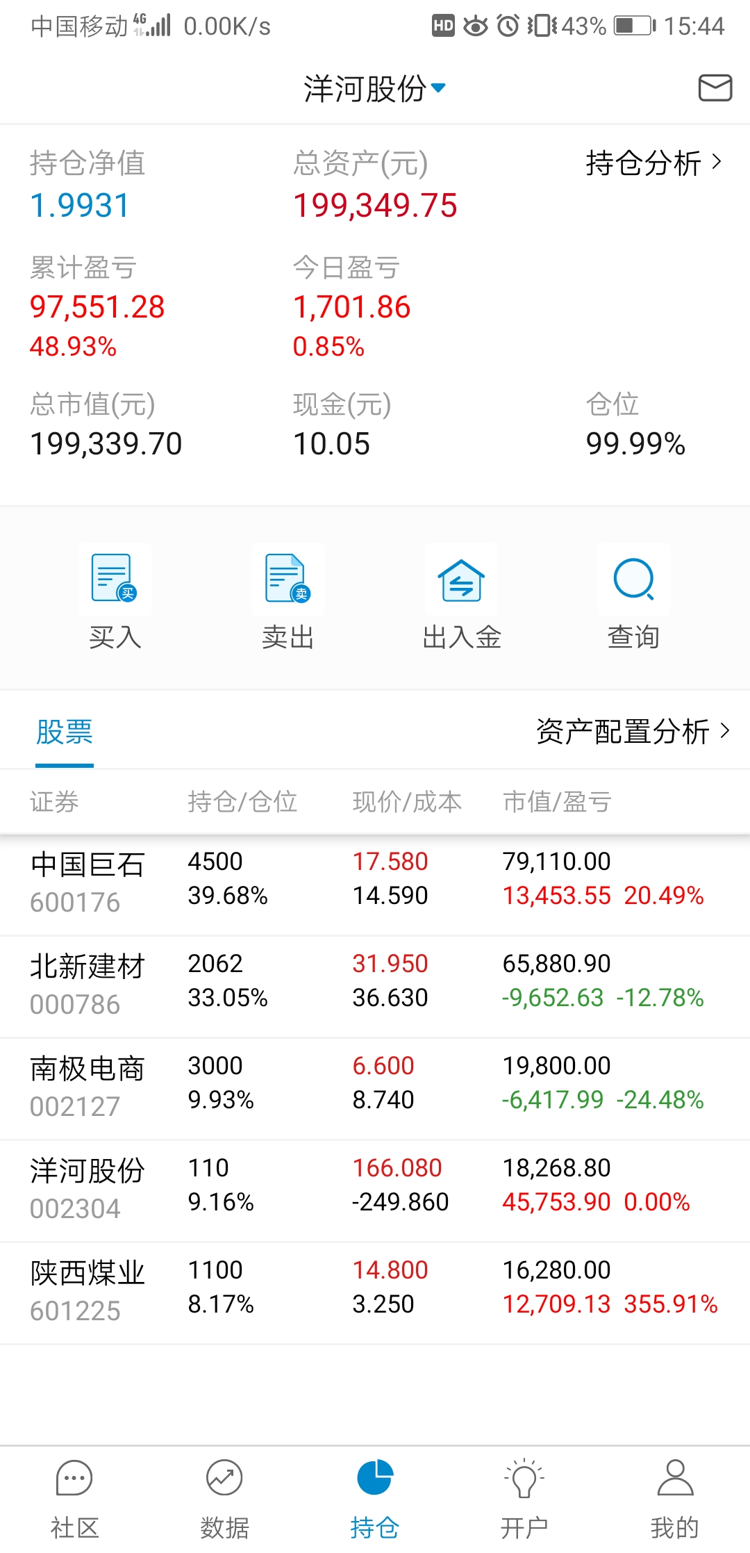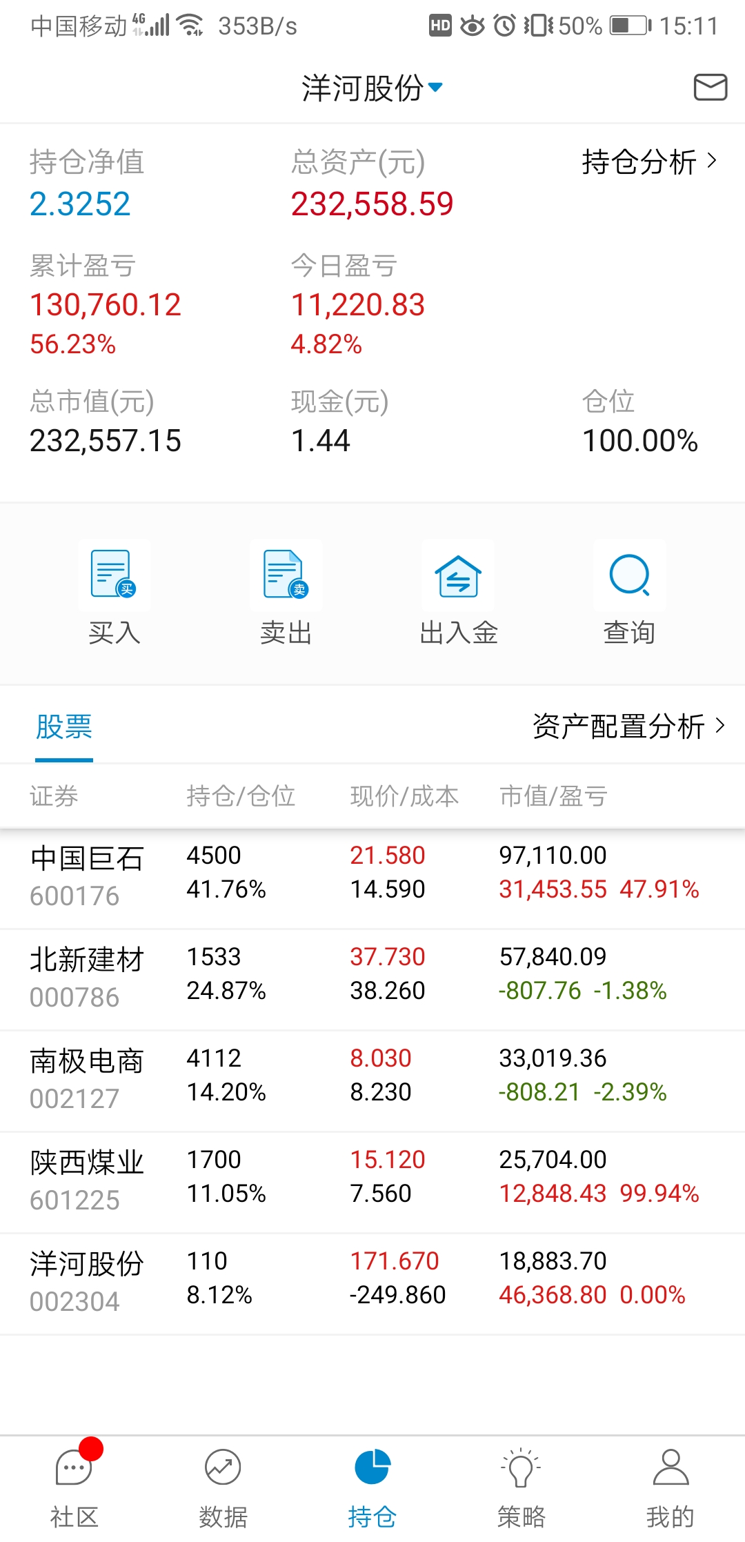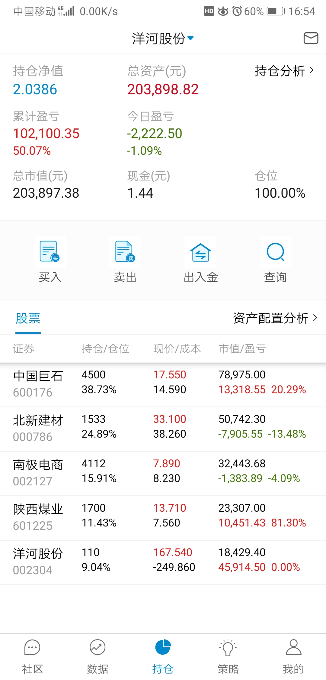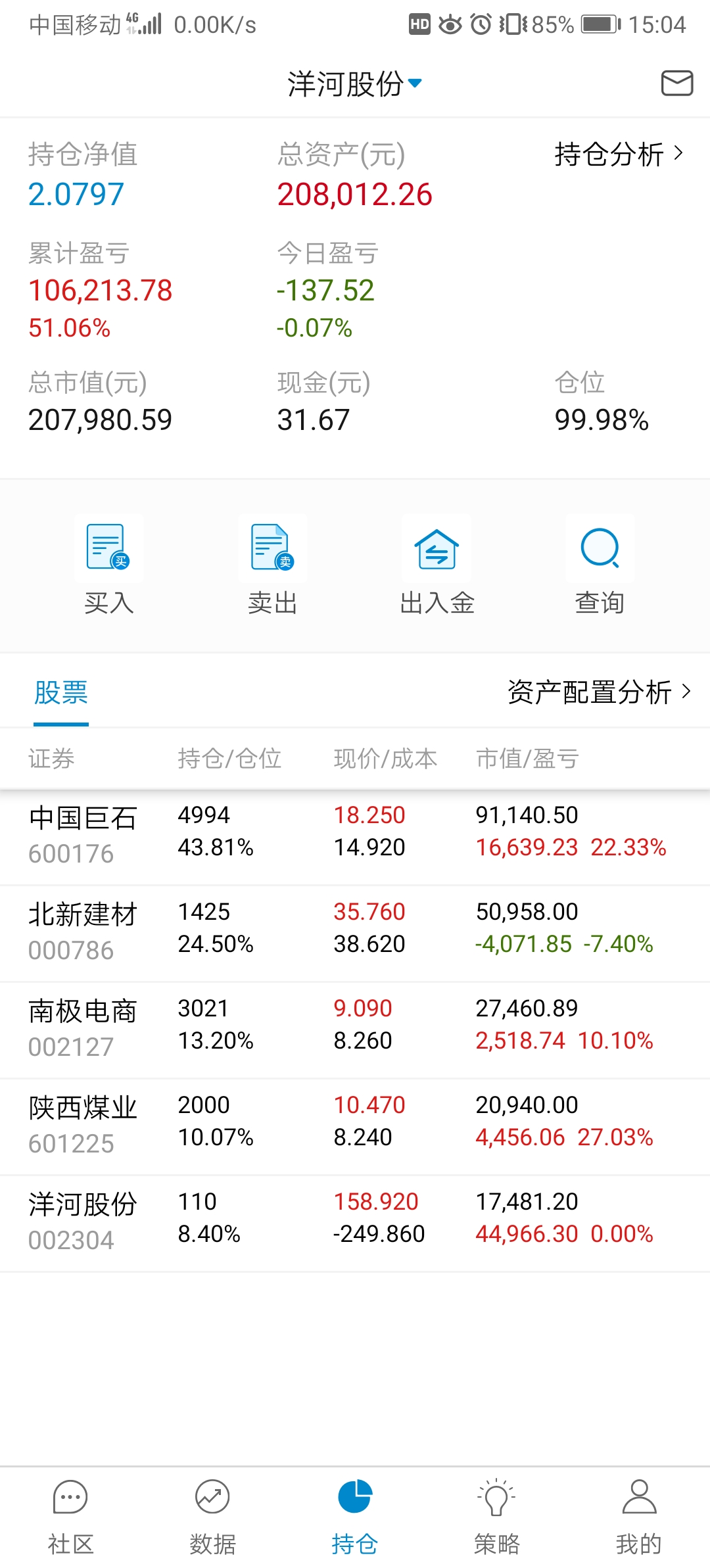 单位搬家,忙活了好几天,有空记录一下,本周应该就操作一次,减洋河加北新建材,洋河,陕煤都分红的钱没加仓,原本预定买陕煤,需要用钱周一准备转出分红家用。
