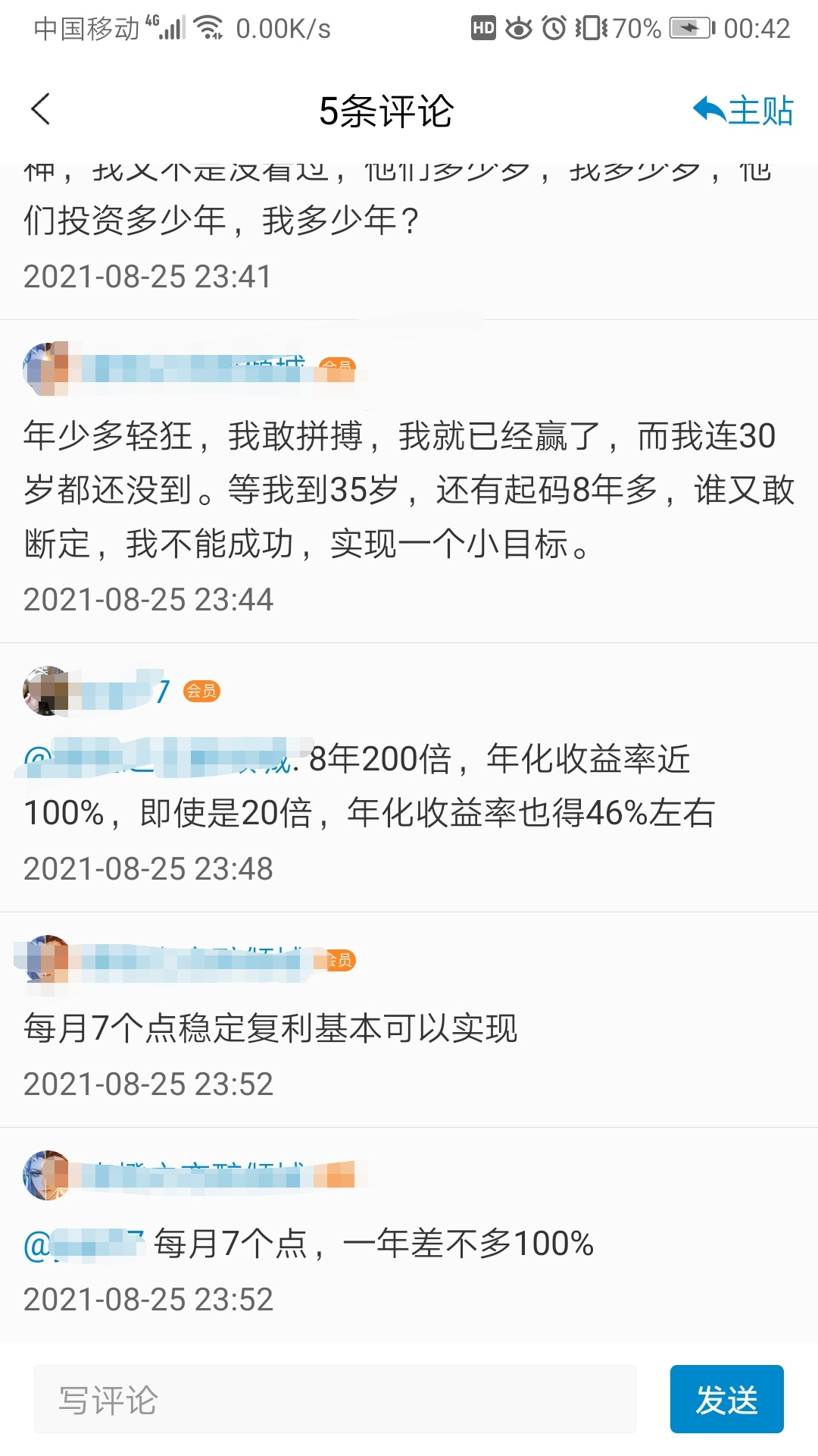 个人对投资很感兴趣,投资年限不算长,需要不断成长进化,个人成长主要通过网络学习和书本自学。只求日拱一卒,看到这么多高手引路早已明白复利的伟大作用并已经印在脑子里了,心态上是不着急的,践行巴神的话:慢慢变富。