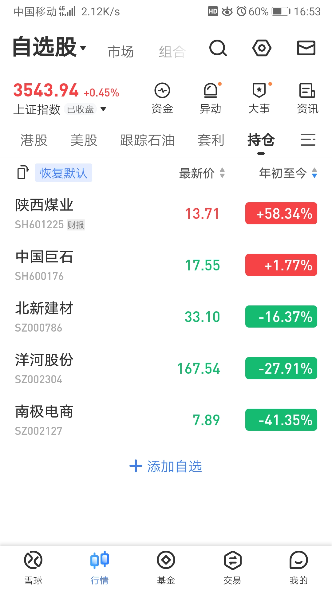 今日大涨的北新建材5.6%,南极电商4.5%,小涨的中国巨石1.8%,洋河和陕煤躺平,当然还有继续封板的南侨食品,感恩感谢,双手合十!超额收益在今年北新、巨石、洋河、陕煤、南极大跌的时候都有一到两次加仓(其中清仓了建行招行塔牌等操作并非不看好,而是比较的结果