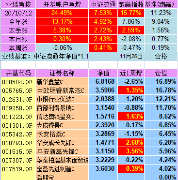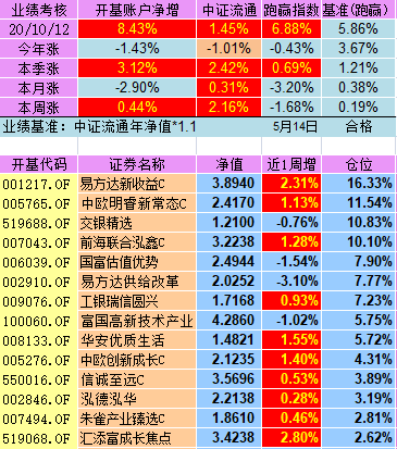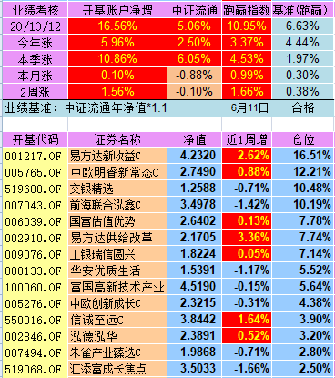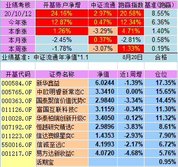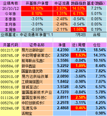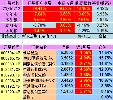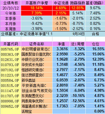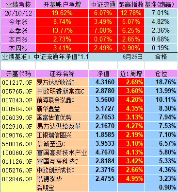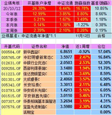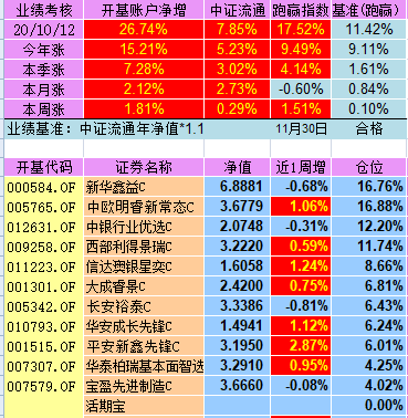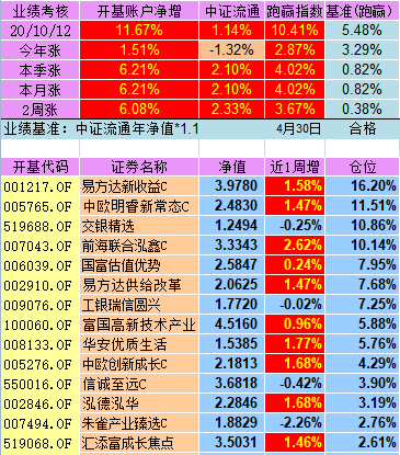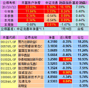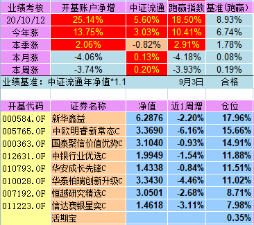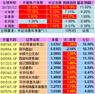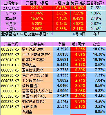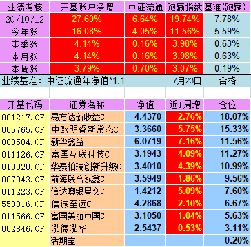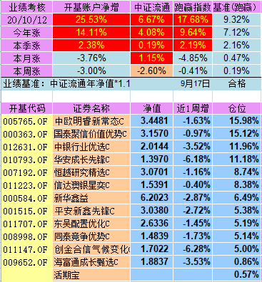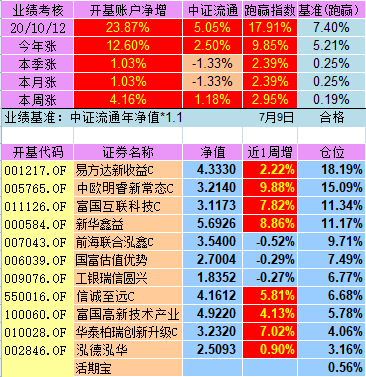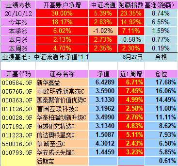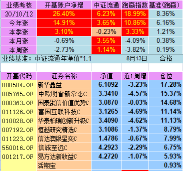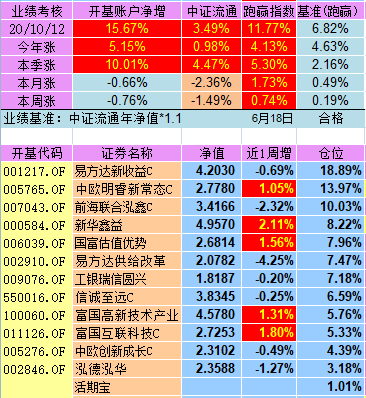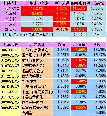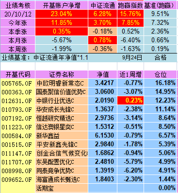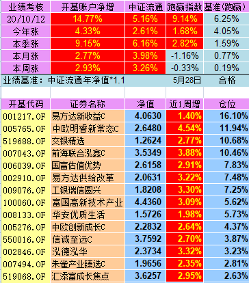截止本周末开基实盘一周年零3天了,开基账户净值增长17.23%,中证流通指数增长4.98%,跑赢指数11.66%,跑赢基准,实际的资金增长是10.76%,因为部分资金是年初高位加进来的,虽然净值跑赢基准但对于开基账户是不满意的,同期总账户净增是29.23%,开基账户是拖后腿的。