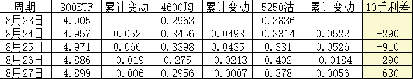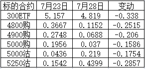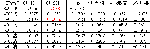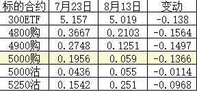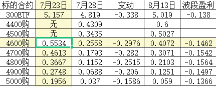这张表其实还给出了另外一个彩蛋,那就是7月23日股价在5.15元以上的时候,卖出当时的虚值认沽8月5000合约(或者从7月5000沽移仓到8月5000沽)最终成绩是最佳的!我自己7月23日在帖子里还幻想到期能让7月5250沽归0,结果鸡飞蛋打就是反面教材。