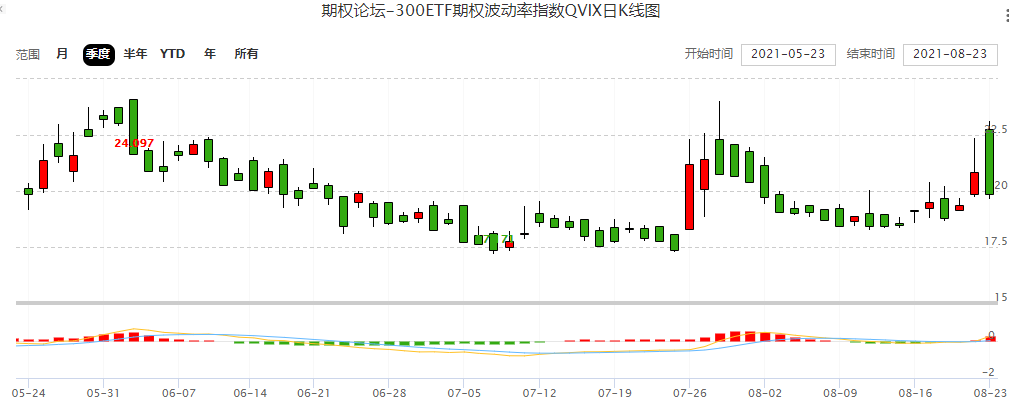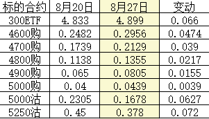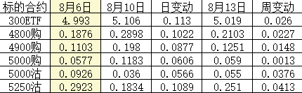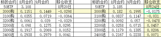 上周五,8月3200沽收盘价0.098元,9月3200沽0.1275元。本周三,8月合约归0,9月合约0.0695元。