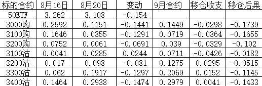 再看7月28日后的下跌段数据,差异就明显了。我们知道在单边下跌过程中期权会跌出时间价值,所以实值认购的跌幅反而会更大一些。也就是因为这个原因,一些精明的交易选手可以从中把握“套利”的机会。这就是前些天论坛某网友执行的认购移仓大法。卖出持有的初始合约向下移仓,相当于卖出高溢价认购+买入低溢价实值认购。