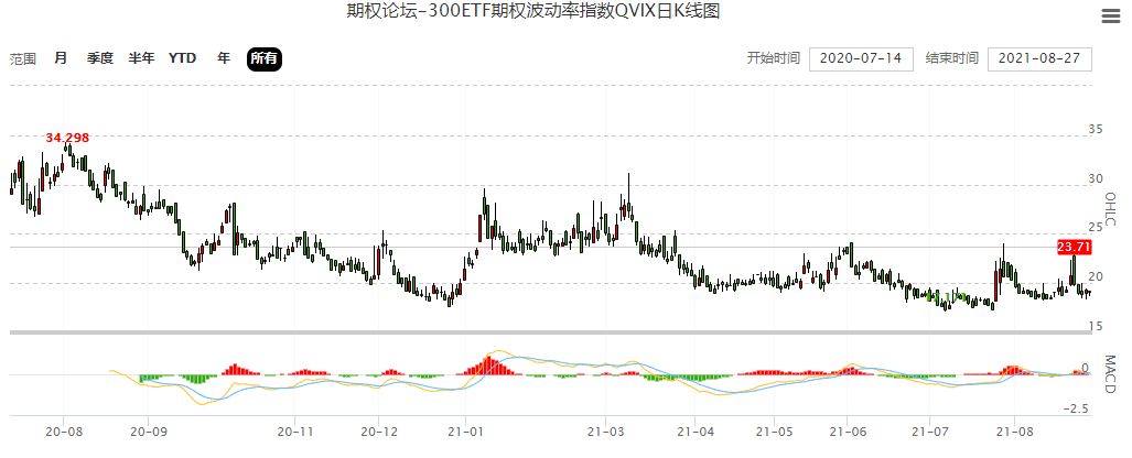 上图是过去一年的300ETF的VIX指数,可以借用分析。我把所有升波数据段列示出来,这个并非马后炮回测,而是用了期权论坛VIX指数的技术分析指标MACD,该知识版权我表示认可的。