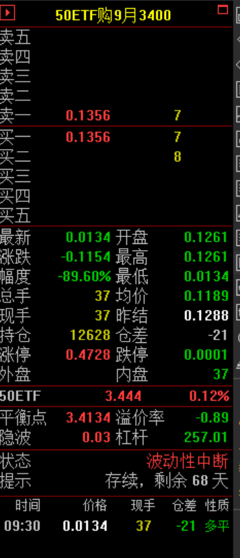 9月3400购合约昨收盘0.1288元,今天开盘价0.1261元,这些为已知数据。很显然,权利仓持有人希望以0.134元挂单,结果输入错误,填写了0.0134元。