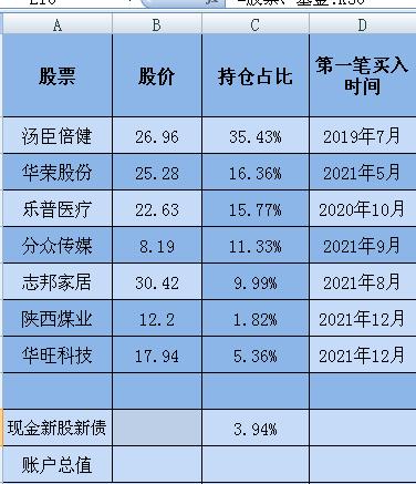 2021年末持仓汤臣倍健、乐普医疗、华荣股份、分众传媒、志邦家居、华旺科技、陕西煤业共7只个股,其中乐普医疗浮亏25%,亏损额占市值达5%,其他的汤臣倍健、华荣股份、分众传媒、志邦家居、华旺科技还是浮盈的,陕西煤业微亏。目前持仓7只个股的平均PE22、ROE 19、股息率2.5%,处于相对合理阶段。