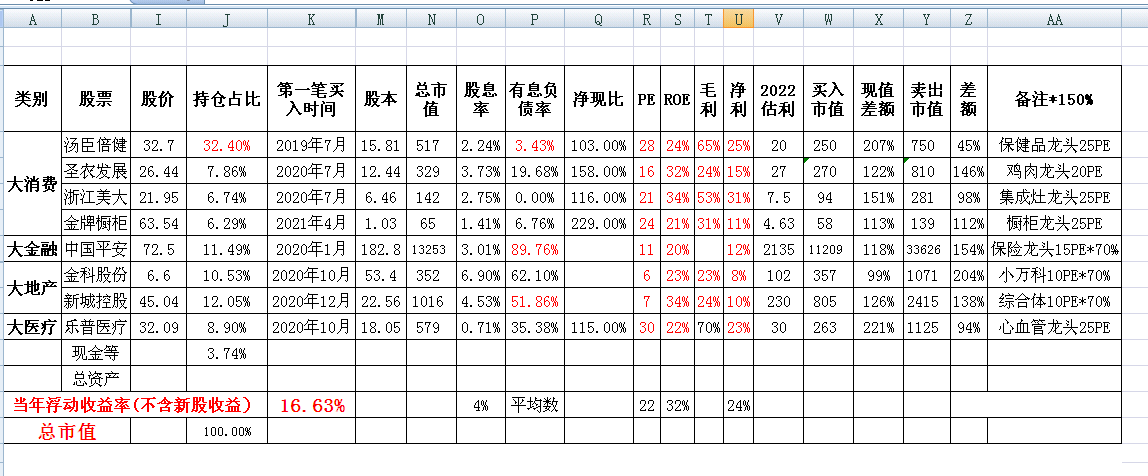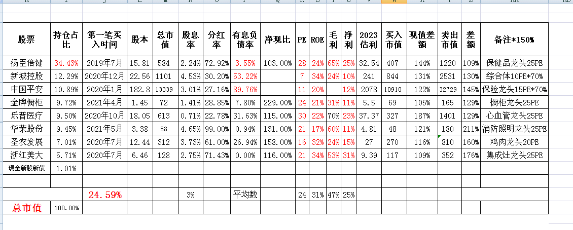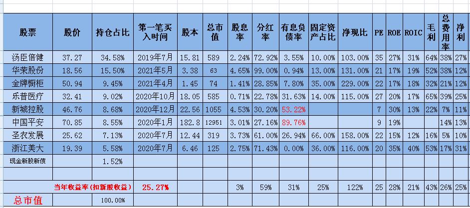 2021年截至本周浮盈25.27%(不含新股),继续保持汤臣倍健第一重仓不动摇,可能今年汤臣倍健如果PE到50会开始减持。继上周清仓金科股份后,本周按计划小幅减持了新城控股和中国平安这两只高杠杆行业个股,地产和保险的行业困难预计还要持续一段时间,这两只的仓位现在都降低到10%左右了,当然新城控股的机会更大。。